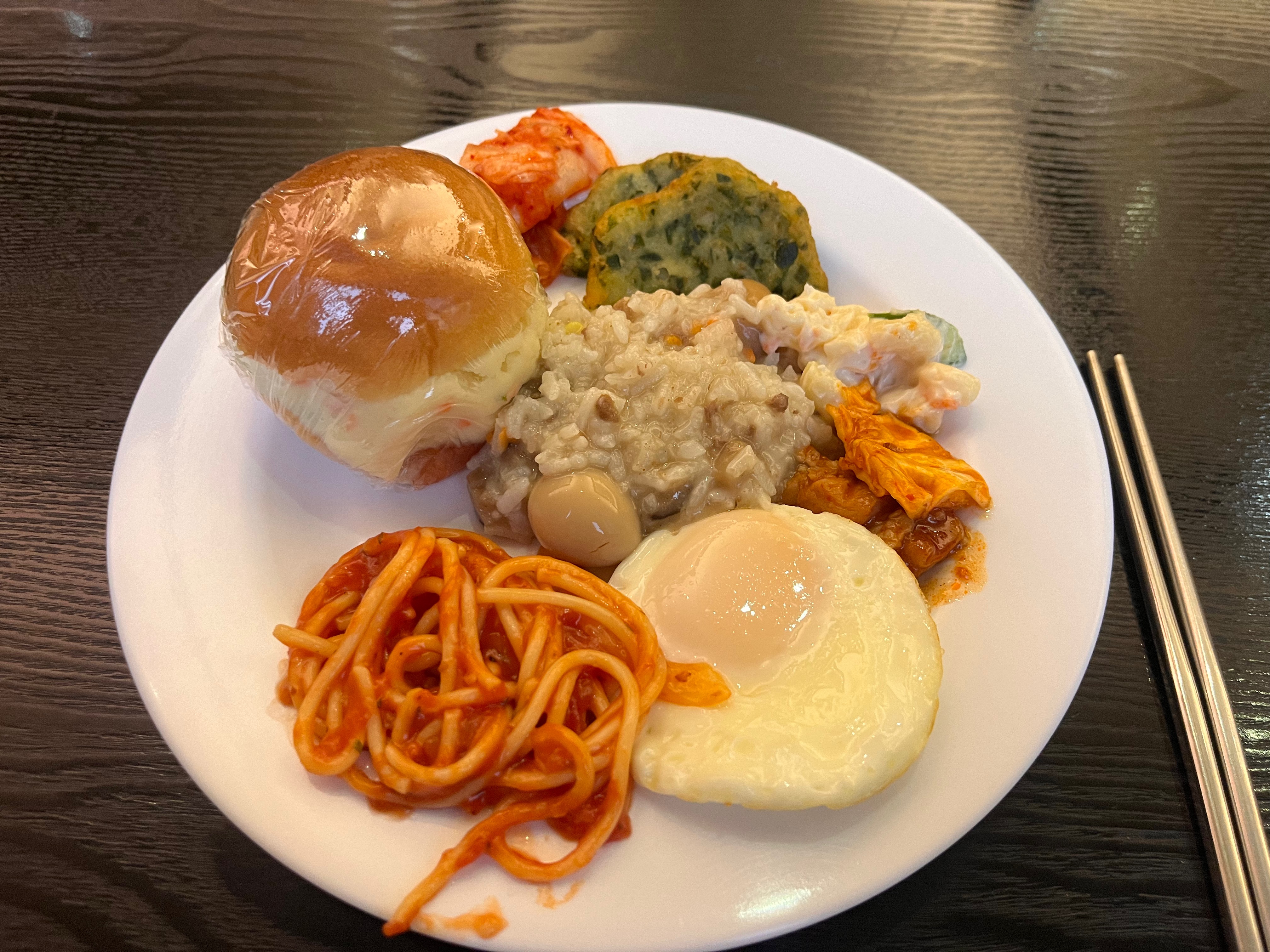 저는 전화로 예약을 했는데, 아고다 같은 플랫폼에서 온라인예약하는 거랑 가격 차이는 없었어요! 다만 현장결제는 조식무료라는 점..! 원래 가격은 7,000원이래요. 그래서 솔직히 많이 기대는 안 했어요. 스크램블이랑 빵 정도 있으려나 정도.