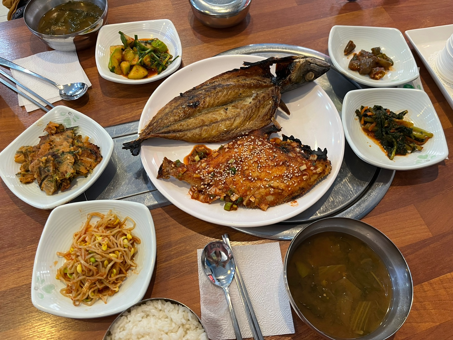 생선구이, 생선조림과 반찬 다섯 가지, 그리고 국.