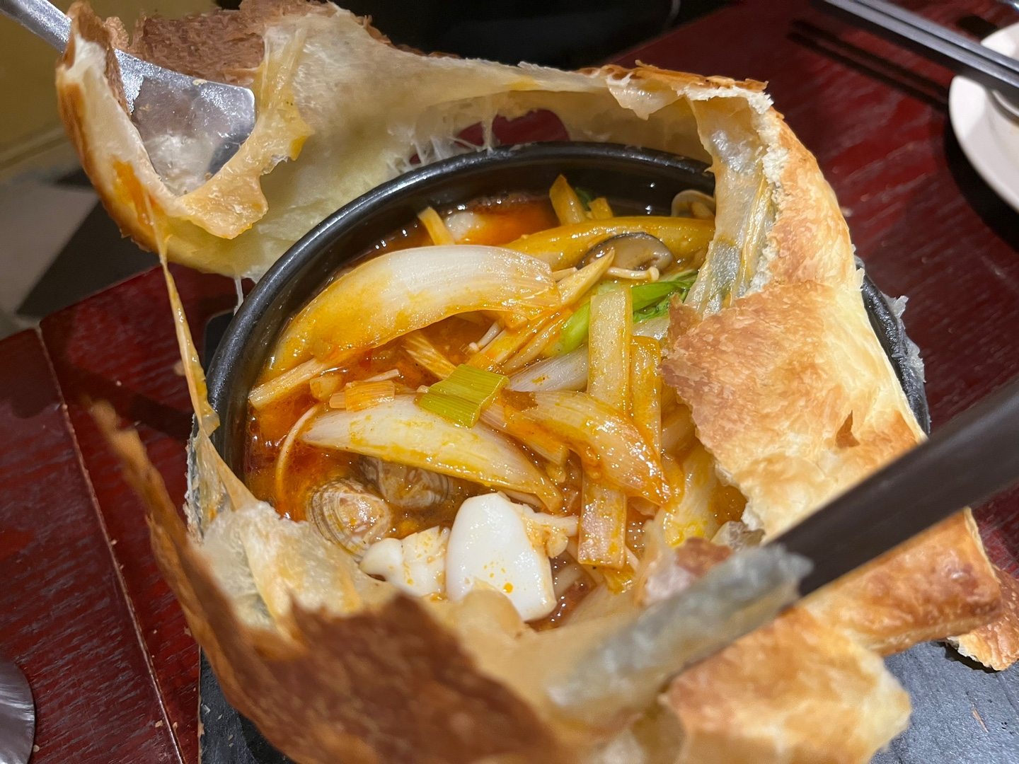 매콤한 중식 해물짬뽕파스타를 페스츄리 빵 안에 넣어 오븐에 구운 요리였는데요. 페스츄리를 찢고 안의 내용물을 빨리 보고 싶게 궁금증을 자극하는 비쥬얼이었어요! 예상외로 첫맛은 좀 달다?라는 인상이었는데, 먹다보니 점점 매콤하더라는..! 국물짬뽕 아니고 볶음 짬뽕에 가까워요. 바지락, 오징어 등이 들어가 있었는데 먹을수록 땡기는 맛이었어요!!