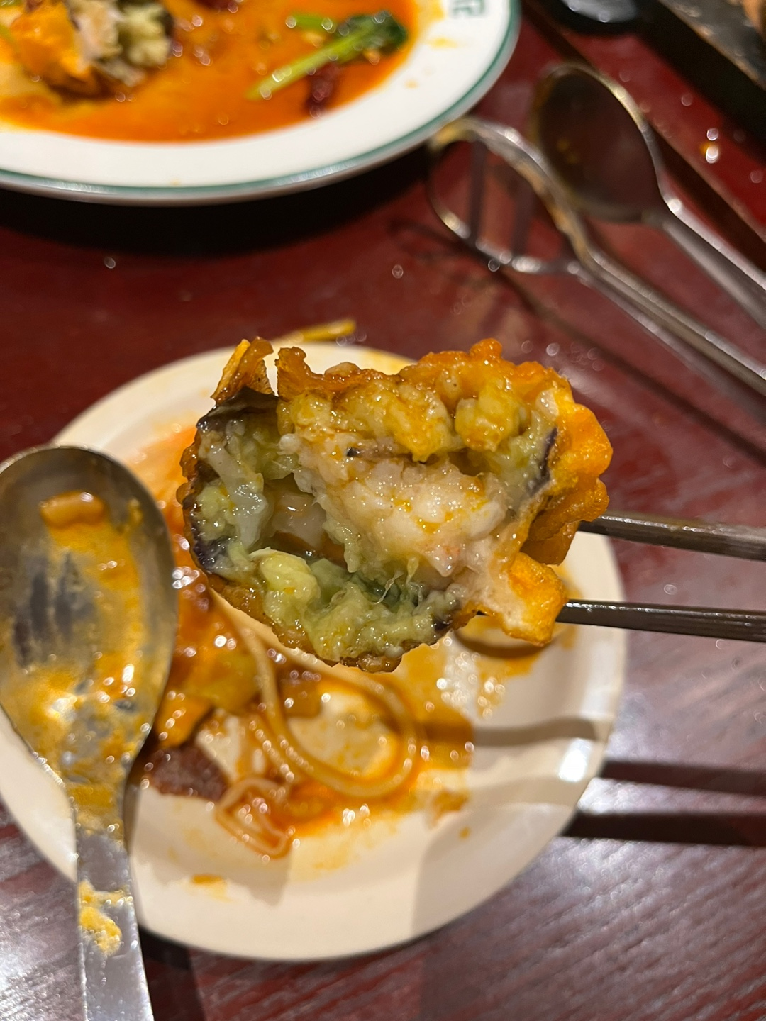 이건 후기부터 넘 좋고, 제가 새우랑 가지는 완전 사랑하는지라 시킬 수 밖에 없었던 메뉴인데요. 겉바까진 아니고 속촉이었던 메뉴였어요! 겉을 살짝 튀긴 가지새우딤섬같은 맛?? 청경채가 함께 조리되어 있어서 청경채 향과 식감도 좋았구요! 깐풍이라고 해서 좀 짤 줄 알았는데, 간이 적당해서 더 좋았던 거 같아요!