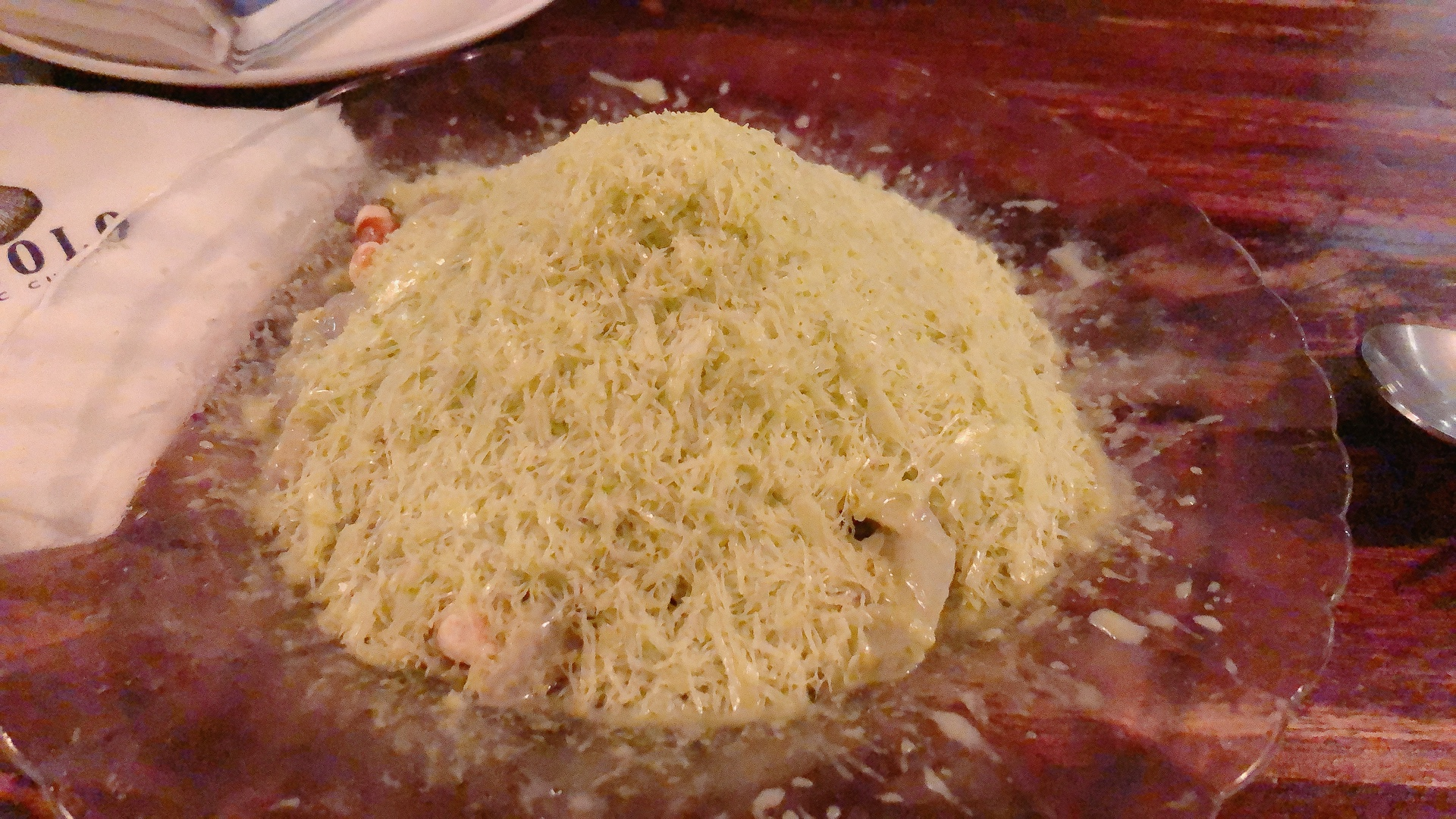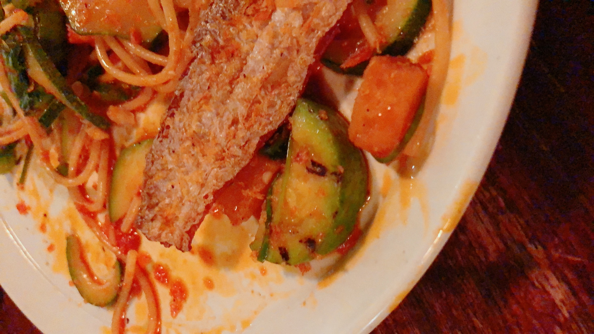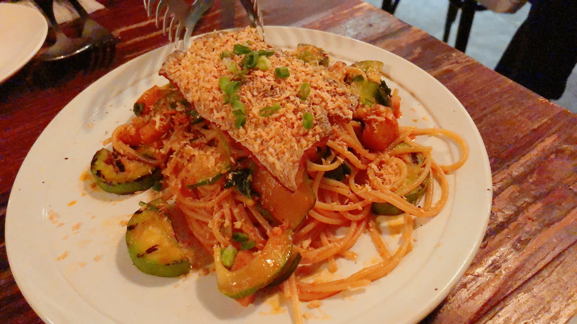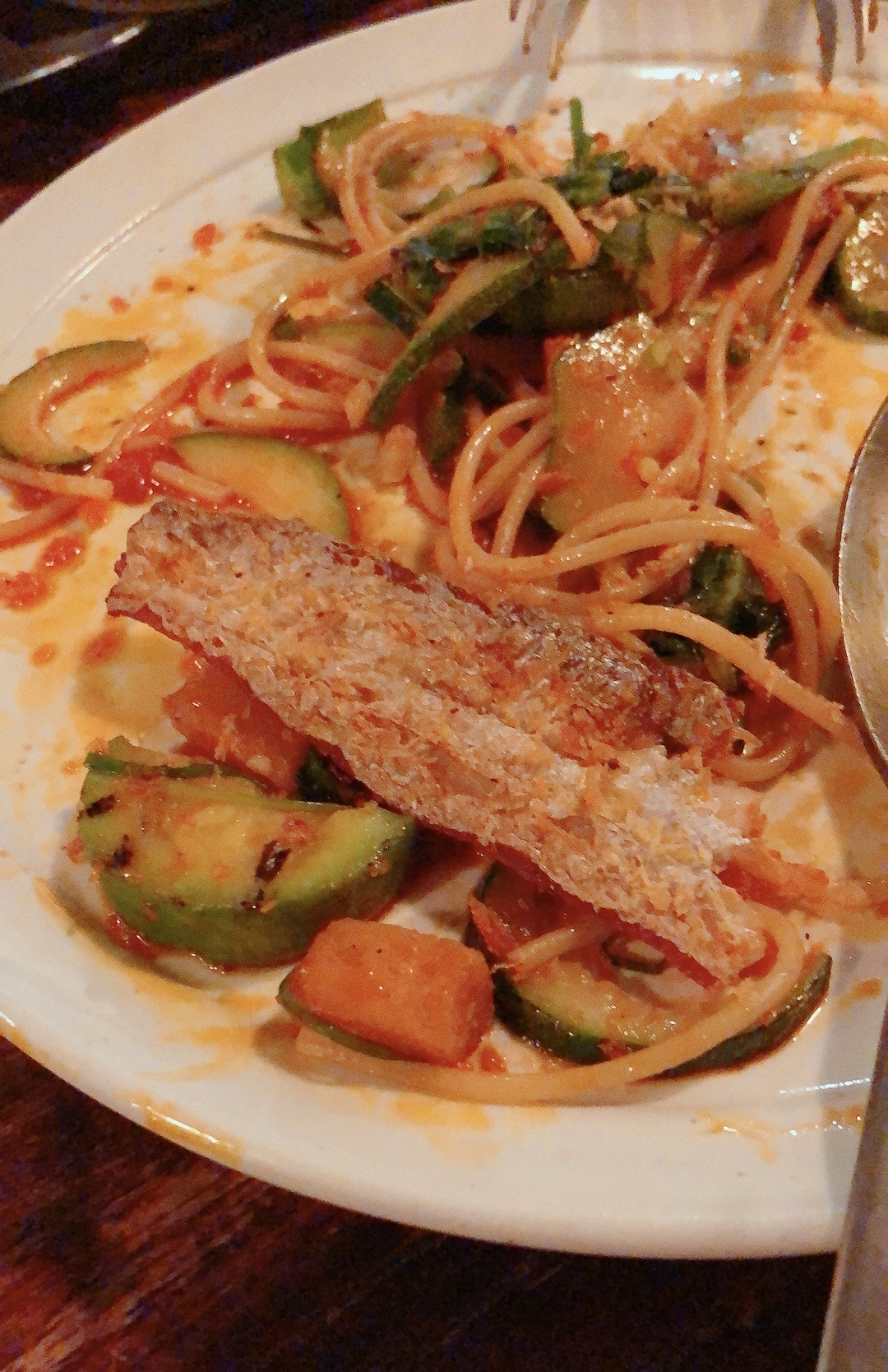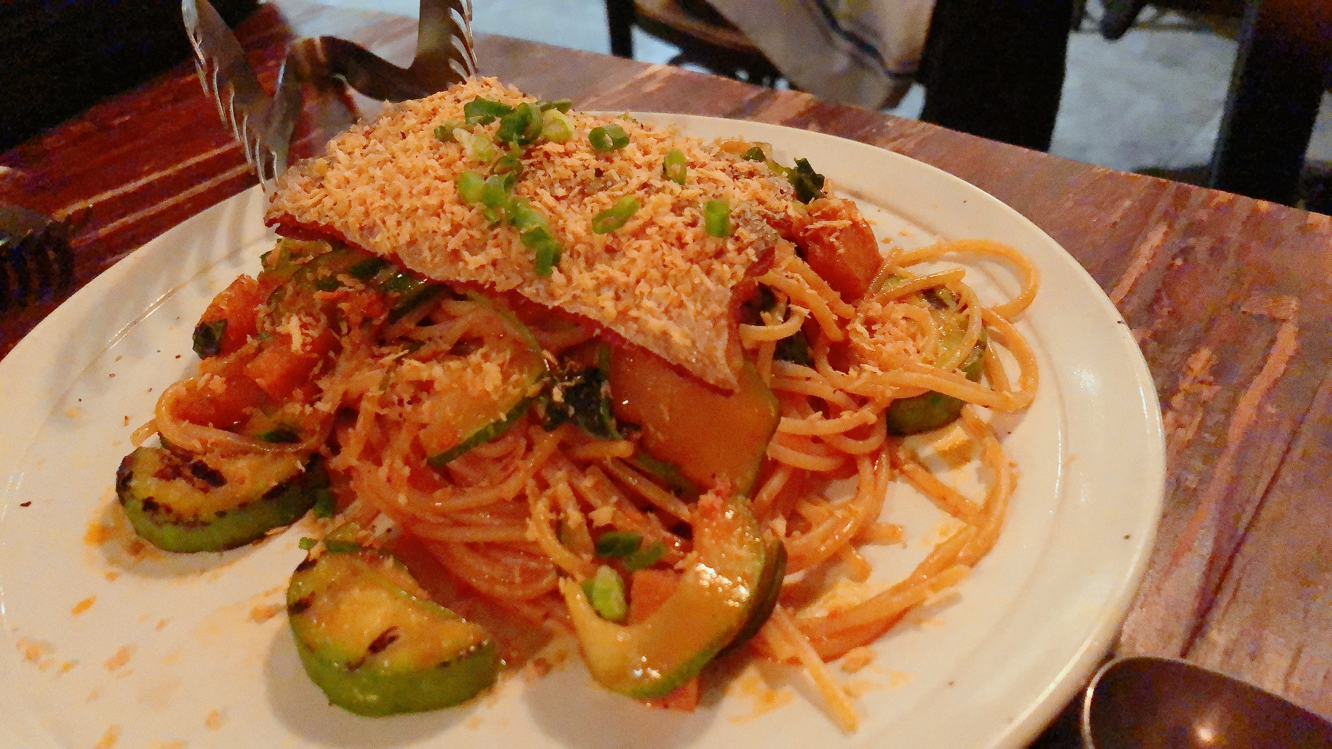 다음으로 나온 갈치스파게티는 일단 가시가 다 발라져 있어서 먹기가 정말 편했습니다. 갈치 위에 뿌려진 튀김가루 느낌의 고명이 부드러운 면과 함께 갈치살을 먹을 때 또다른 식감을 더 해줘서 좋았습니다. 호박이 우리나라 애호박, 주키니(서양애호박), 단호박 등 세 종류나 들어가 있었습니다. 개인적으로는 애호박이 두껍게 썰려 있어서 씹을 때마다 육즙이 나와서 촉촉해서 제일 좋았습니다. 단호박도 갈치스파게티의 짭짤함에 달콤함을 살짝 곁들여줘서 좋았어요. 주키니는 얇아서 별로 존재감이 없었기 때문에 주키니 대신에 애호박이 더 들어 있었으면 좋았을 거 같다고 생각했습니다. 갈치젓갈이 들어간 스파게티인만큼 비리진 않을까 걱정했었는데, 전혀 비리다고 느끼지 못했습니다. 먹을수록 약간 짜다는 느낌을 받긴 했지만 광어고수빙수랑 번갈아 먹으니까 밸런스가 맞고, 애호박과 단호박을 먹으면 또 간이 맞는 느낌이라서 끝까지 맛있게 먹었습니다.