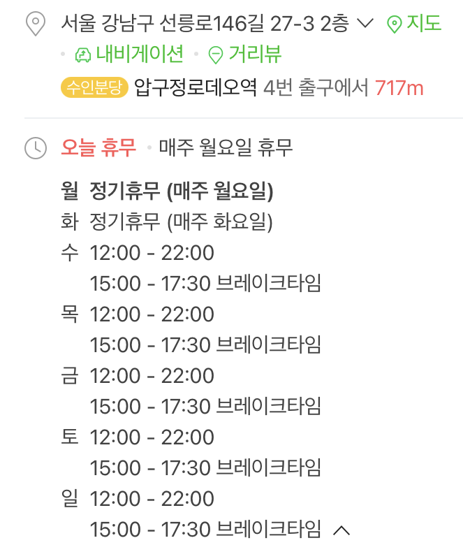 전화해보니까 손님이 워낙 많아서 100%예약제라고 하더라구요. 그래서 저희는 토요일 7시반에 예약해서 가게 되었습니다. 위치는 압구정로데오역과 강남구청역 사이인데, 역에서 도보로 10~12분 정도이고 주택가 안에 있기 때문에 위치나 교통이 좋은 편이라고 할 수는 없을 것 같습니다. 그리고 도착해보니 사람이 정말 많았습니다. 예쁘고 아담한 카페 같은 인테리어 였는데 공간이 생각보다 협소하고 테이블간의 간격이 좁은 편이라서 기념일에 갈만한 레스토랑은 아니라는생각이 들었습니다. 많이 시끄러운 편이라서 분위기를 낼 수 있는 곳은 아닐 것 같습니다.
