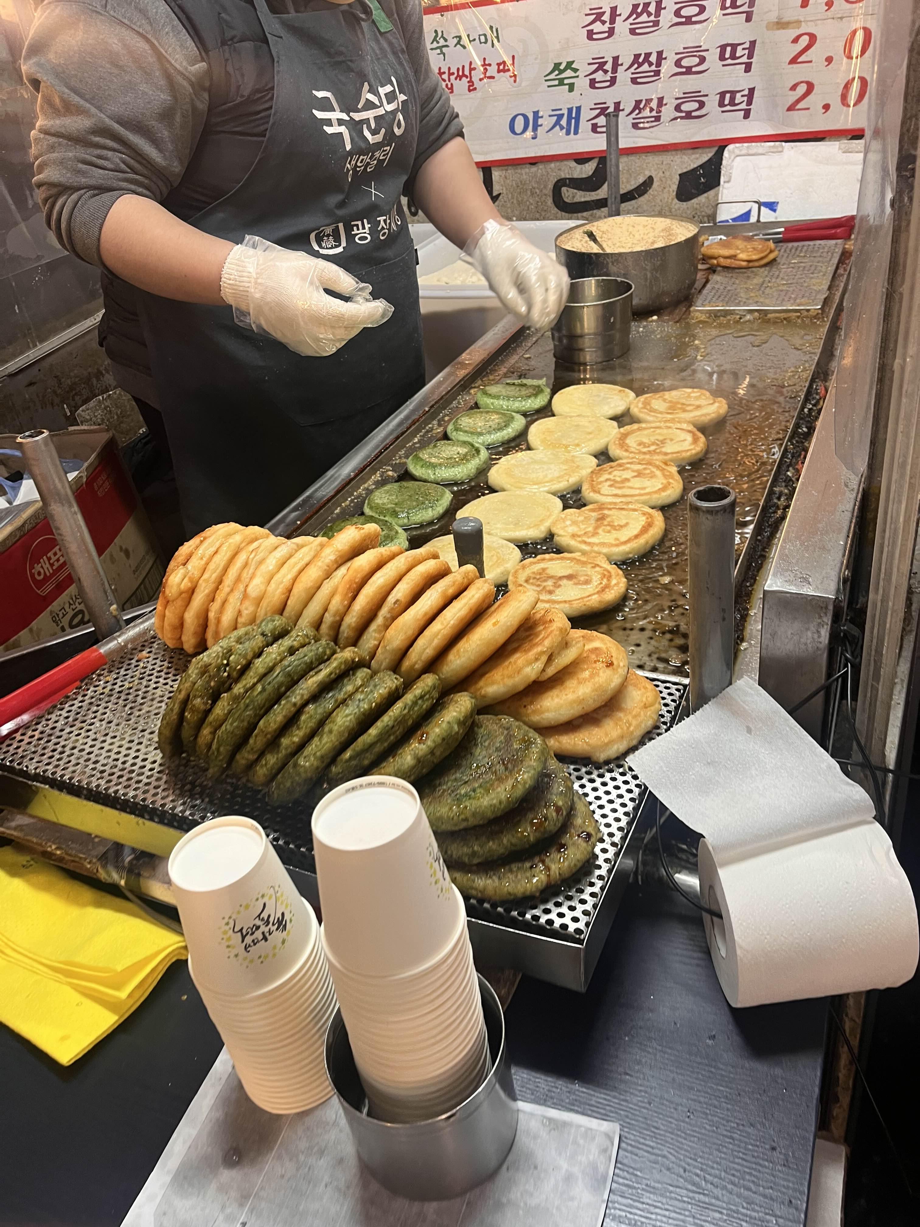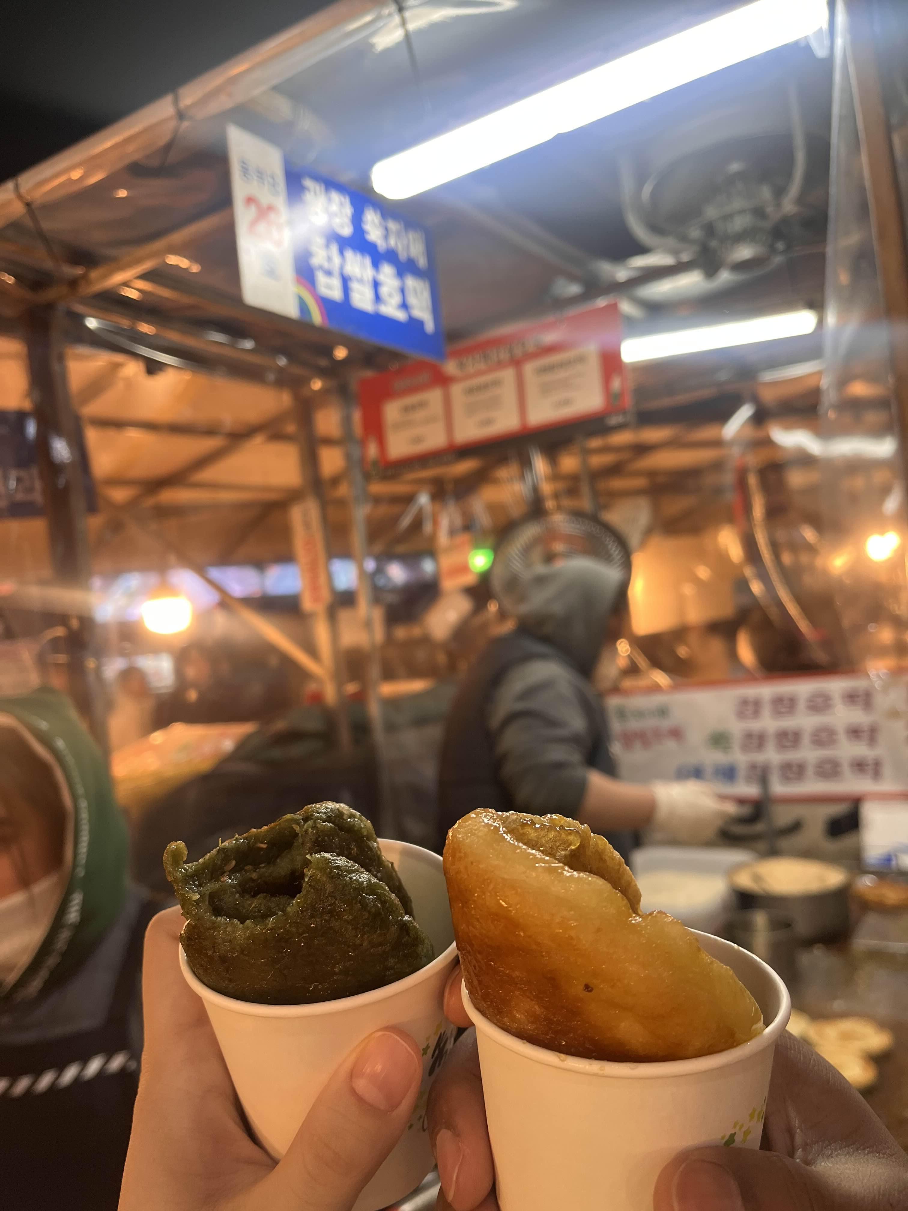 광장시장은 입구가 참 많은데, 붕어빵, 찹쌀꽈배기, 광장호떡 등 웨이팅이 엄청 긴 맛집들이 많죠..? 피자붕어빵 궁금해서 먹으러 갔다가 못 찾고 호떡도 땡겨서 먹어보려고 보니 대기가 긴 곳과 대기가 아예 없는 곳이 대비되더라구요ㅎㅎ 그런데 광장호떡도 인절미호떡도 오래 대기까지 해서 먹을 일인가 싶어서 그 옆에 대기 없는 [쑥자매 찹쌀호떡]에서 사먹기로 했습니다. 제가 쑥향과 맛을 좋아하기도 하고 쫄깃쫄깃 식감을 좋아해서 선택했는데, 정말 딱 제 취향의 맛이더라구요..!