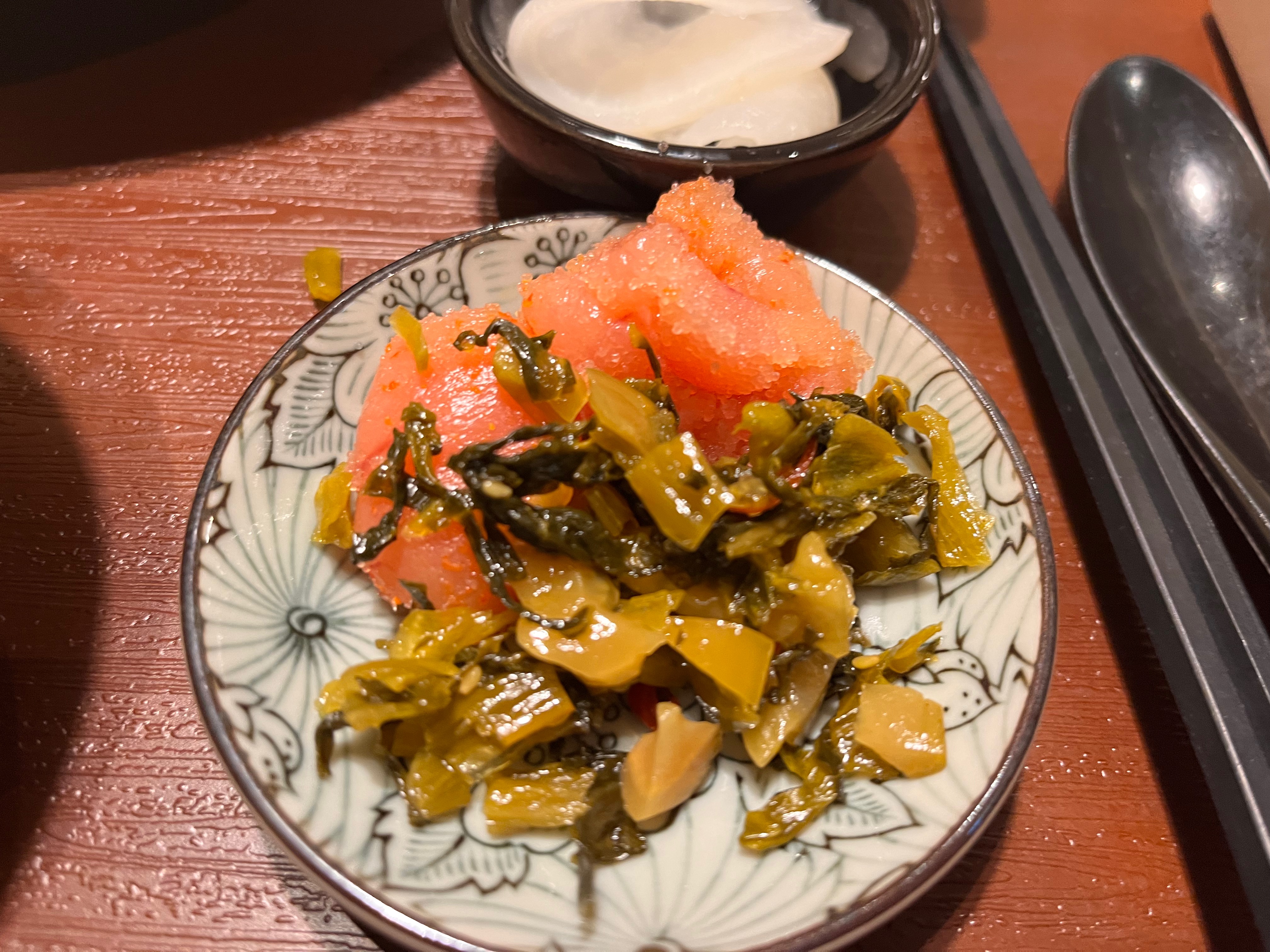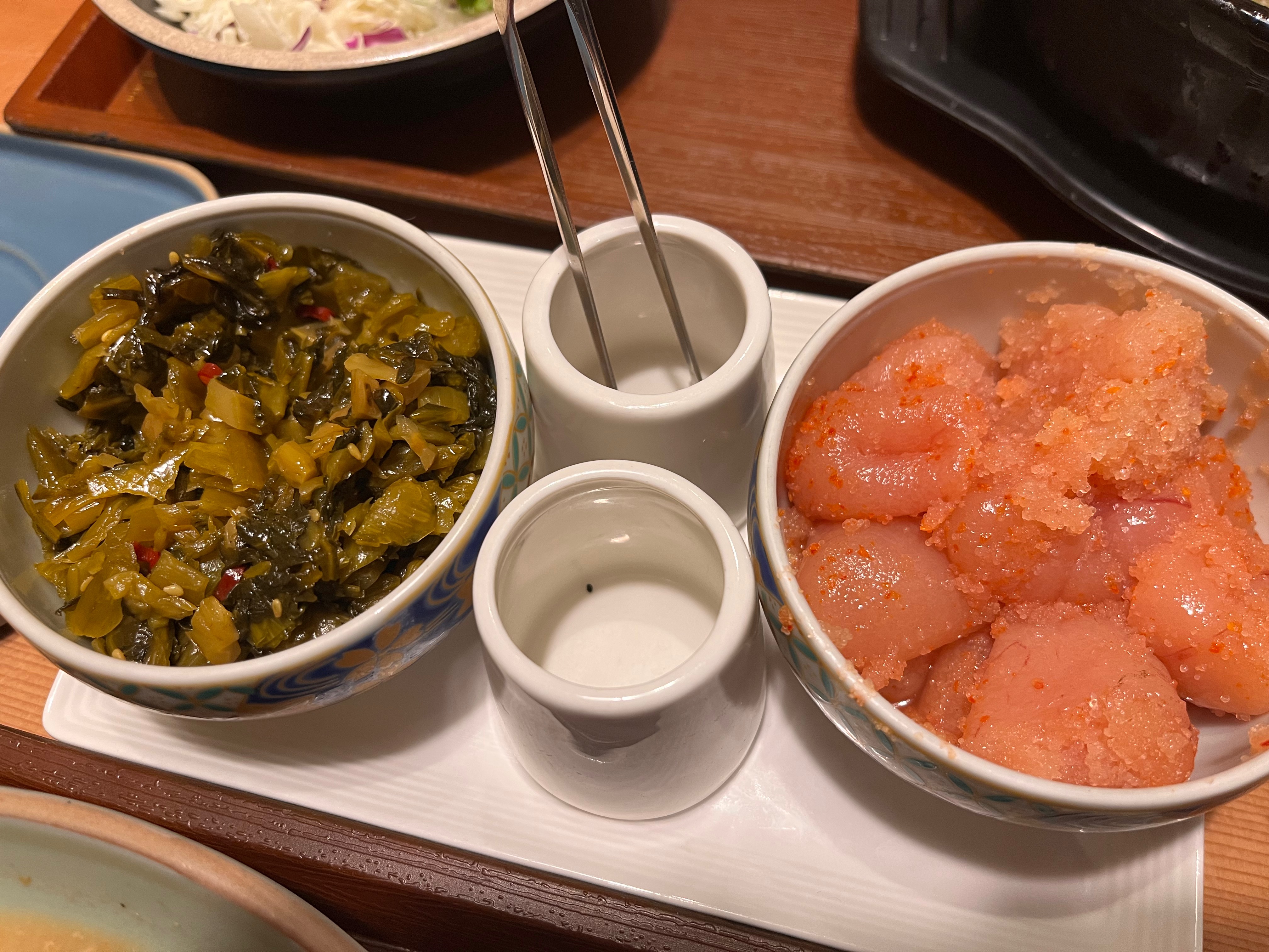 그리고 무한리필 사이드로 나오는 명란젓과 타카나!😍일본에서 명란젓은 모츠나베와 같이 후쿠오카 지방에서 유명한 음식이에요. 명란젓은 재일교포들이 팔기 시작해서 유명해졌다죠. 그래도 확실히 한국보다 일본에서 더 인기 있는 반찬인 거 같아요. 요즘은 한국에서도 많이 먹게 되었지만요. 그에 비해 타카나는 한국에서는 찾기 힘든 반찬인데, 요게요게 또 요물이라 볶음우동에 같이 볶아서 버터랑 명란젓이랑 먹으면 아주 막있걸랑요ㅋㅋㅋ 아 너무 산으로 가네요🤣 여튼, 여기선 명란젓과 타카나를 무한리필로 먹을 수 있고, 각 메인메뉴도 충실해서 조카도 저도 밥 한 공기씩 리필해서 먹었어요😆 밥 리필도 공짜👍👍