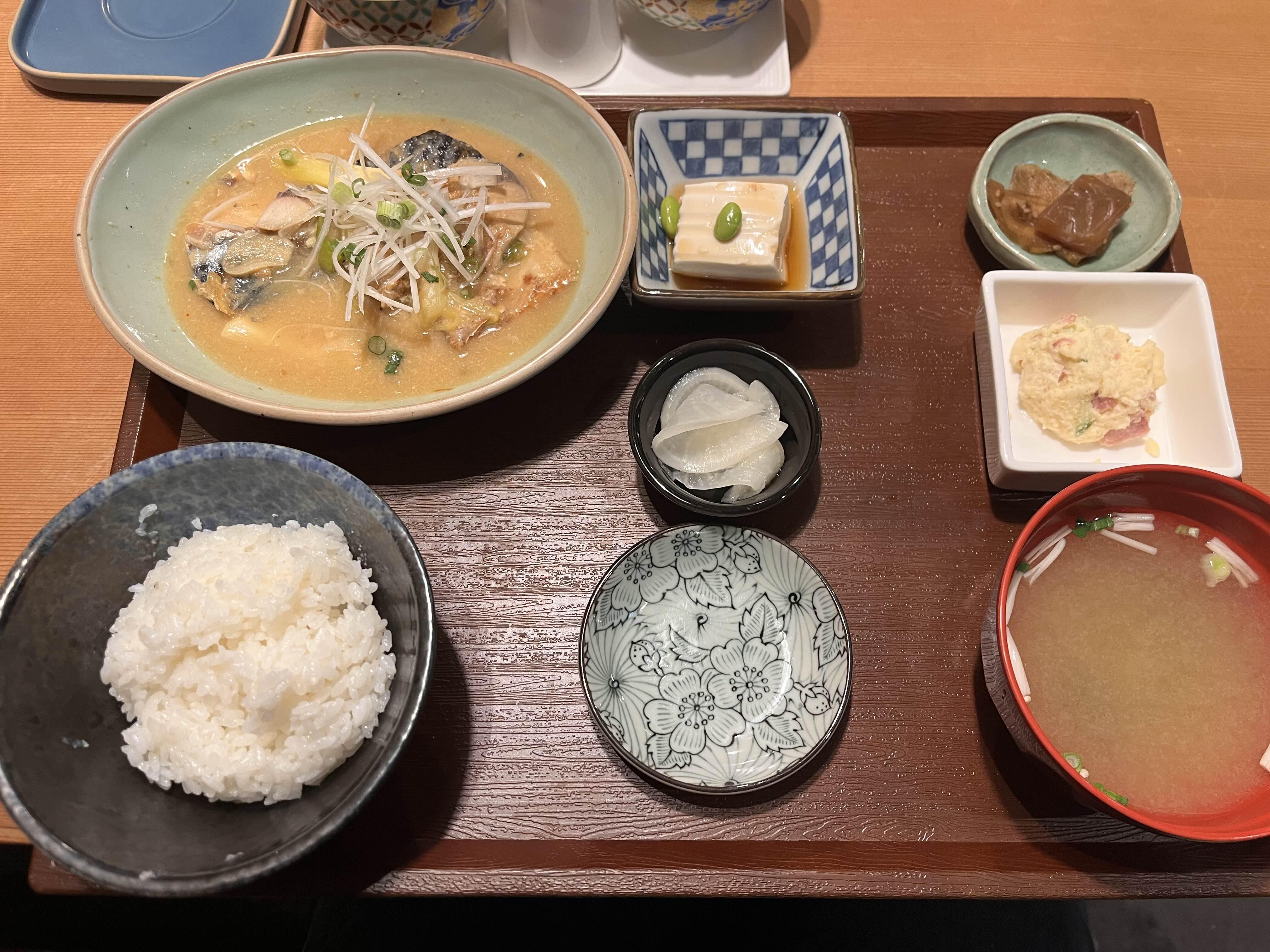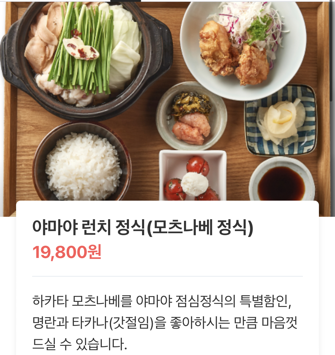 조카는 모츠나베정식(19,800), 저는 고등어미소조림정식(14,900)을 주문했습니다! 모츠나베정식은 가라아게가 함께 나오고, 고등어미소조림정식은 연두부와 미소장국이 함께 나왔어요.