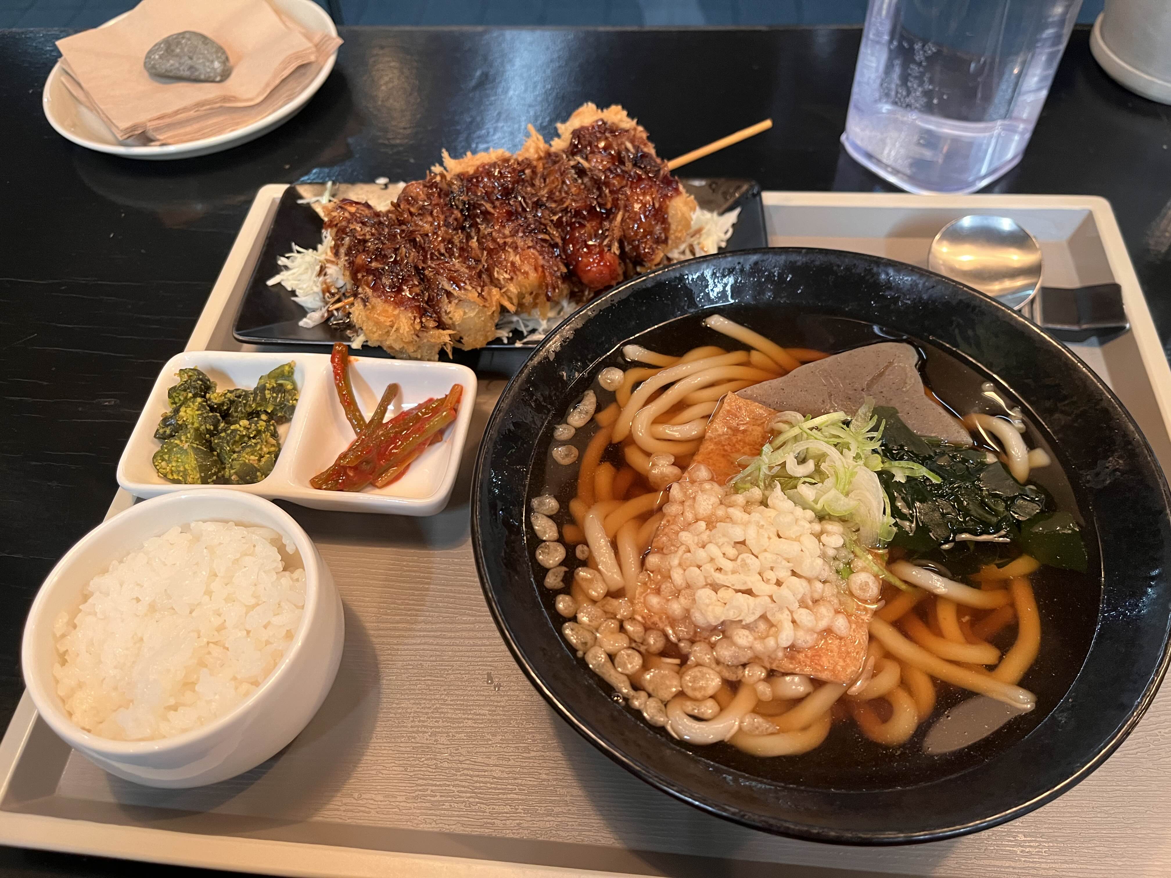 여름한정메뉴로 나왔던 냉라멘정식(냉라멘과 로스카츠슬라이스)이 너무 맛있었어서, 이번에 방문했을 때 겨울한정메뉴가 있길래 주문해보았습니다. [쿠시카츠 우동정식], 가격은 13,000원. 로스카츠가 12,000원이고 히레카츠가 13,000원인 것을 생각하면 고기가 적게 들어가는 쿠시카츠우동정식이 13,000원이라는 것에는 좀 아쉬움이 남습니다. 11,000원 정도가 적당하지 않았을까. 그래도 맛과 그 조합은 칭찬해주고 싶습니다. 사장님 맛잘알이셔~~!!😋👍👍