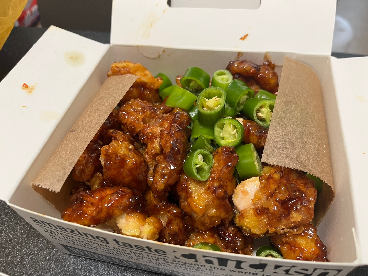 닭강정은 스몰로 시켰어요. 8천원이구요. 라지사이즈는 16,000원이에요. 청양고추 같이 먹으면 꽤나 매워요. 근데 매콤하면서 속살이 부드러워서 정말 맛있게 먹었어요. 청양고추는 너무 많이 올려주시는 거 같아 많이 남겼네요ㅜ