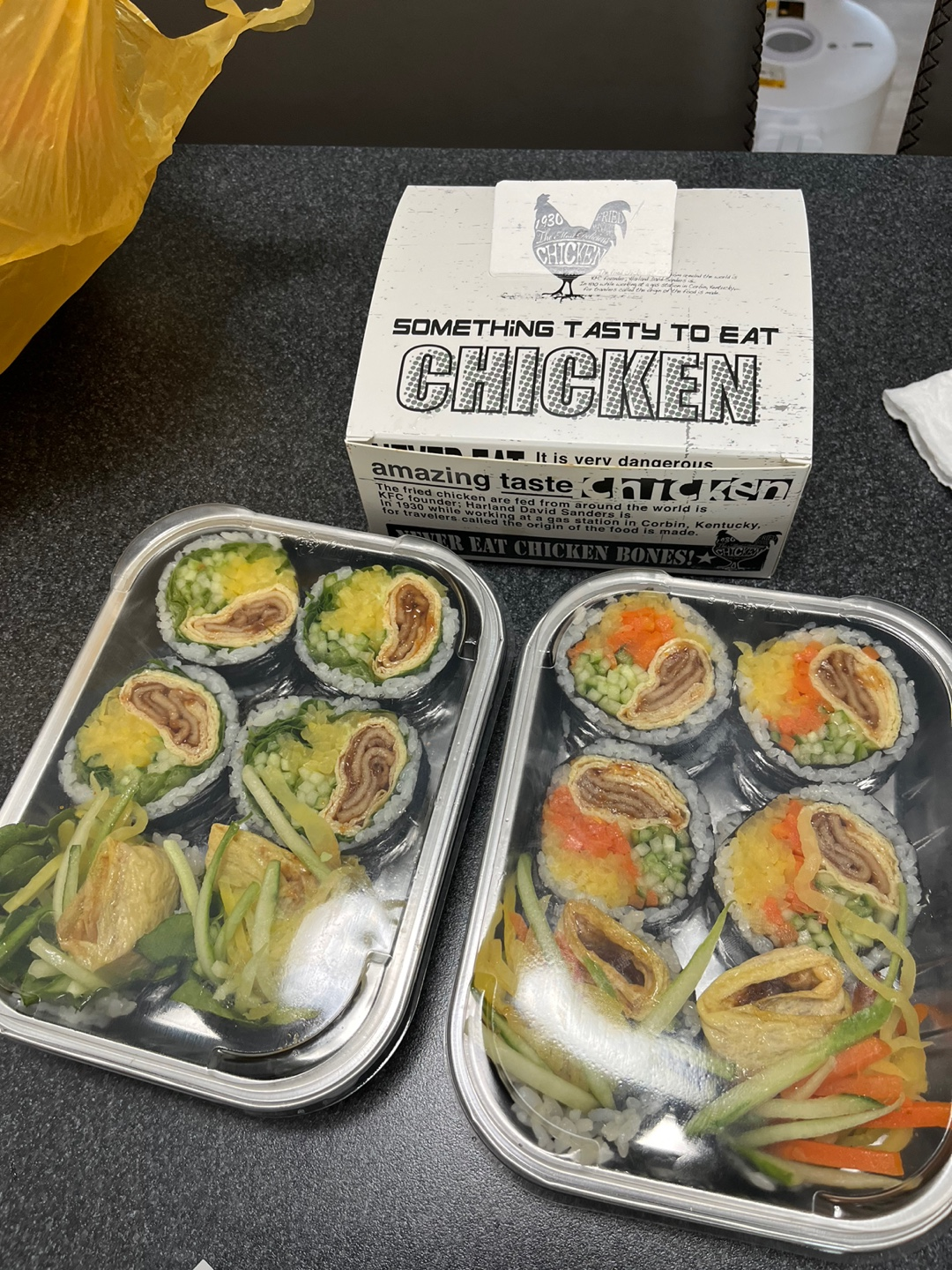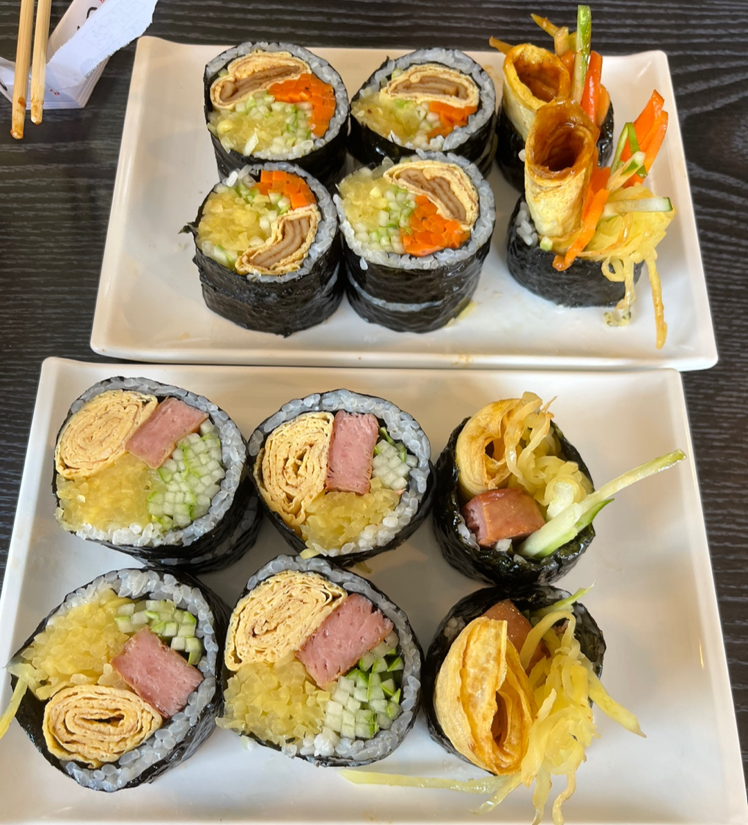 제가 제일 맛있었던건 스팸김밥이었어요! 짭쪼름한 스팸의 맛을 누가 거역할 수 있겠냐만은, 폭신한 계란이 더 들어가서 간이 딱 맞고, 지금 이 글을 쓰면서도 침이 나올 정도로 환상적인 조합이었습니다.