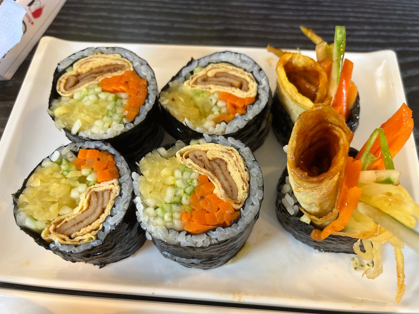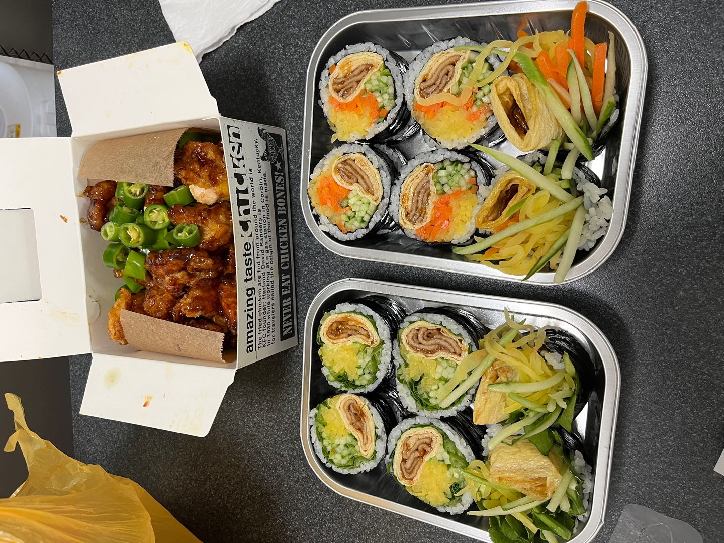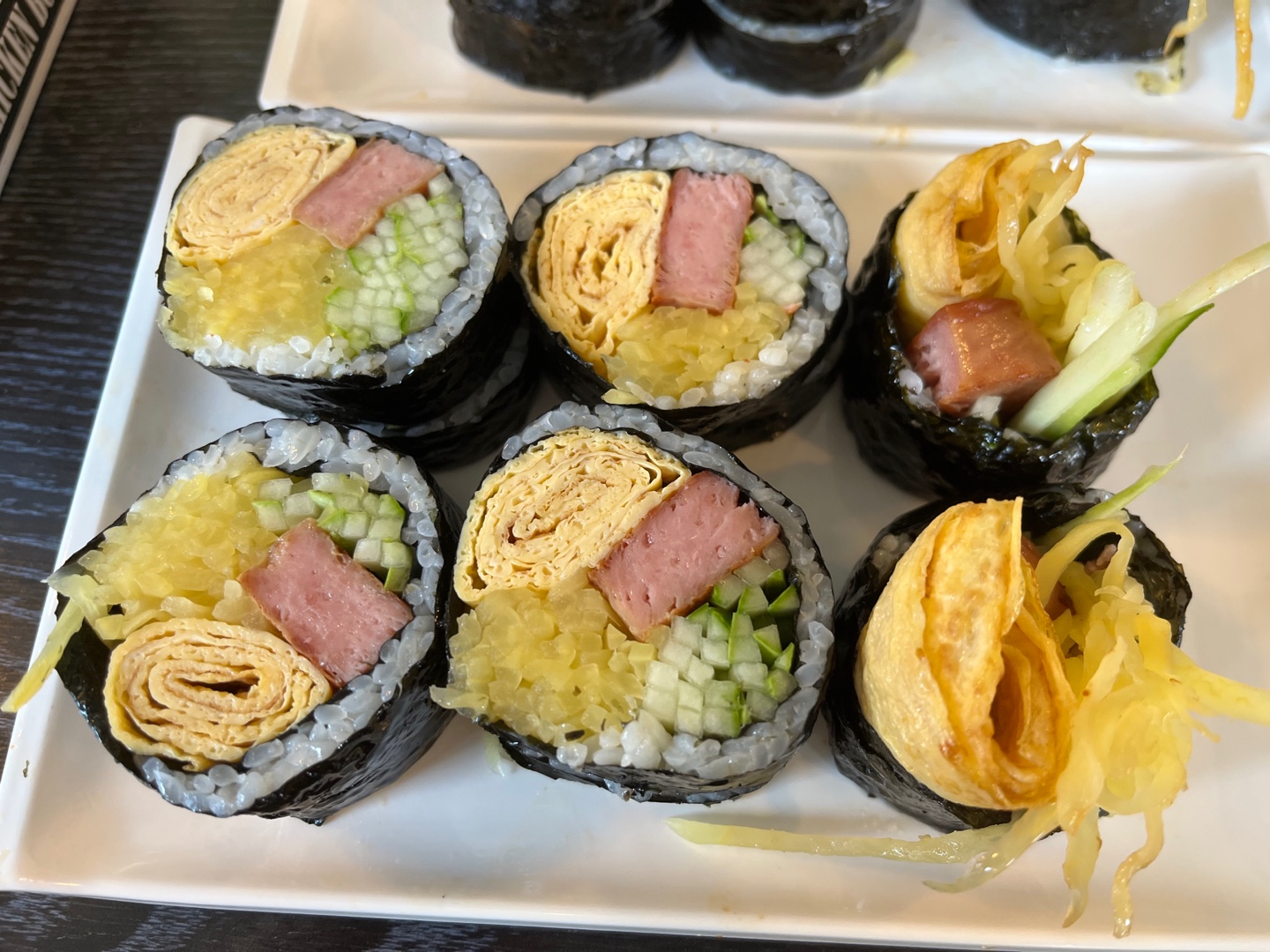 제가 제일 맛있었던건 스팸김밥이었어요! 짭쪼름한 스팸의 맛을 누가 거역할 수 있겠냐만은, 폭신한 계란이 더 들어가서 간이 딱 맞고, 지금 이 글을 쓰면서도 침이 나올 정도로 환상적인 조합이었습니다.