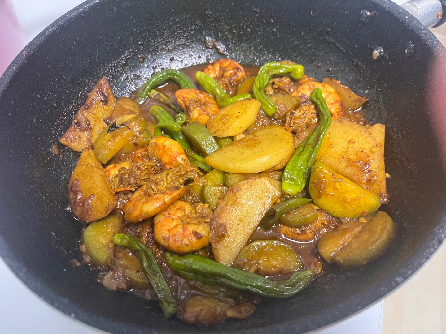 남자친구가 요리하는 걸 좋아해서 가끔 날잡고 방글라데시 요리를 해주는데, 라마단을 앞두고 요리를 해주고 싶다고 뭐가 먹고 싶냐고 해서 지금까지 먹었던 것들 중 제일 맛있었던 새우 애호박 커리를 해달라고 했어요. 맛을 보면 커리라고 하기는 애매하지만, 우리나라요리 대부분에 고추장, 된장, 간장이 들어가는 것처럼 방글라데시요리에도 대부분 강황과 커민이 들어가기 때문에 그 두 가지가 들어가면 편하게 커리라고 부르고 있습니다. 다만 우리가 흔히 먹는 카레가루와는 달리 전분과 설탕이 들어가지 않아서 더 담백한 맛이 납니다. 우리가 흔히 먹는 덮밥처럼 먹거나 난과 먹는 커리와는 달리 재료가 큼직큼직해서 재료의 맛을 잘 살린 요리예요. 새우와 애호박은 강황과 커민으로 요리했을 때 가장 맛있지 않을까 싶을 정도로 너무 잘 어울리고 간간해서 밥도둑입니다. 새우도 방이시장 수산마켓에서 냉동새우 해동한 것을 반만 샀고(오천원!), 애호박도 집에 남아있던 거 가져와서 요리했는데도 탱글탱글한 식감이 살아나서 정말 맛있었어요! 부재료로는 감자와 꽈리고추를 넣었어요!