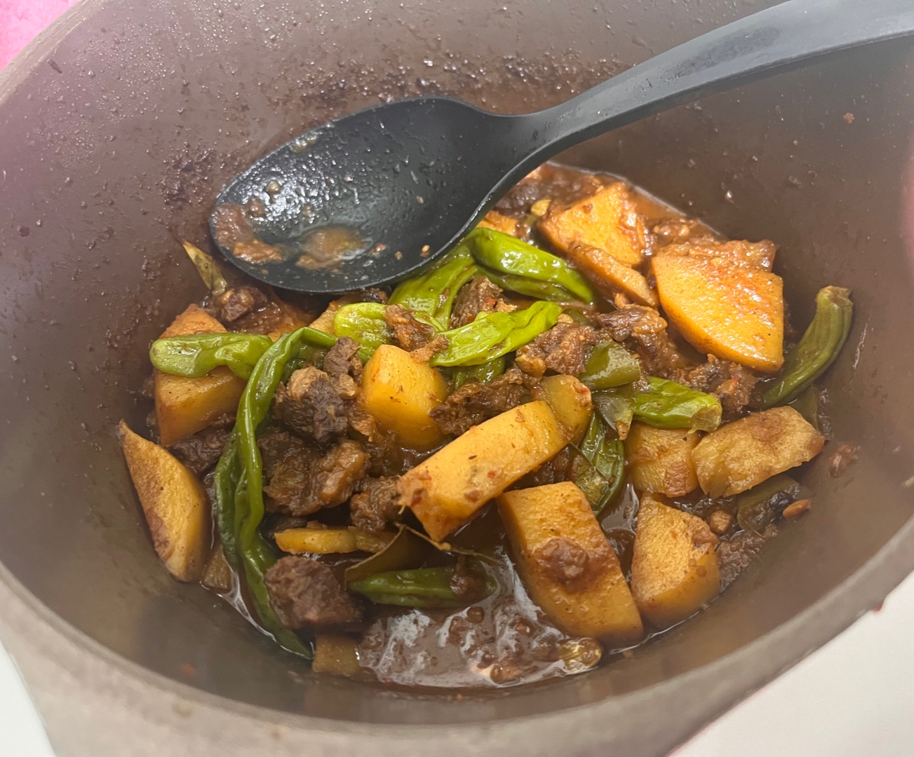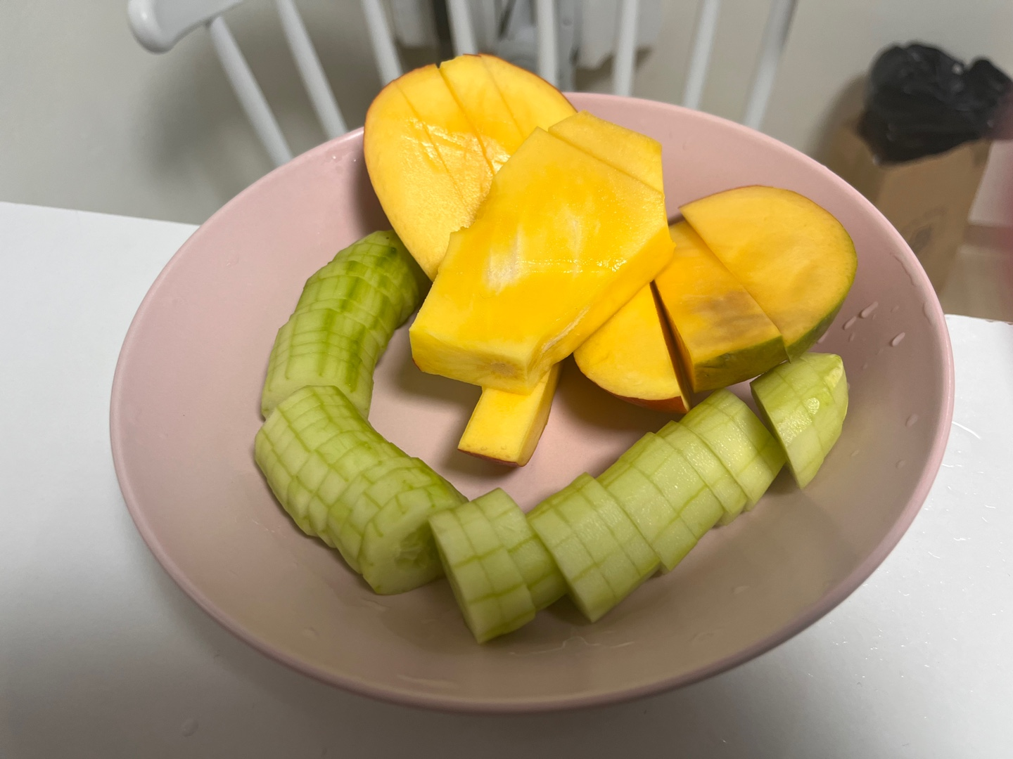 소고기커리도 해줬는데, 역시 소고기(한우 200g!)와 커리(강황과 커민)의 조화는 불문율이랄까요? 메인재료만 달라진 걸텐데도 매력이 다른 맛! 다만, 소고기커리를 했던 냄비가 약간 상태가 안 좋았는지 타서(방글라데시요리는 오래 끓이거나 볶아야하는 경우가 많음!) 냄비에 눌러붙어서 ㅠ ㅠ 탄맛이 섞였었어요. 그래도 한우가 캐리해줘서 식감도 좋고 먹을만한 정도였지만 평소보다 잘 안 되서 아쉬웠답니다. 방글라데시요리가 대부분 간간하다보니 생오이를 저렇게 잘라서 항상 같이 먹어요. 필리핀산 애플망고도 후식으로 먹었습니다.