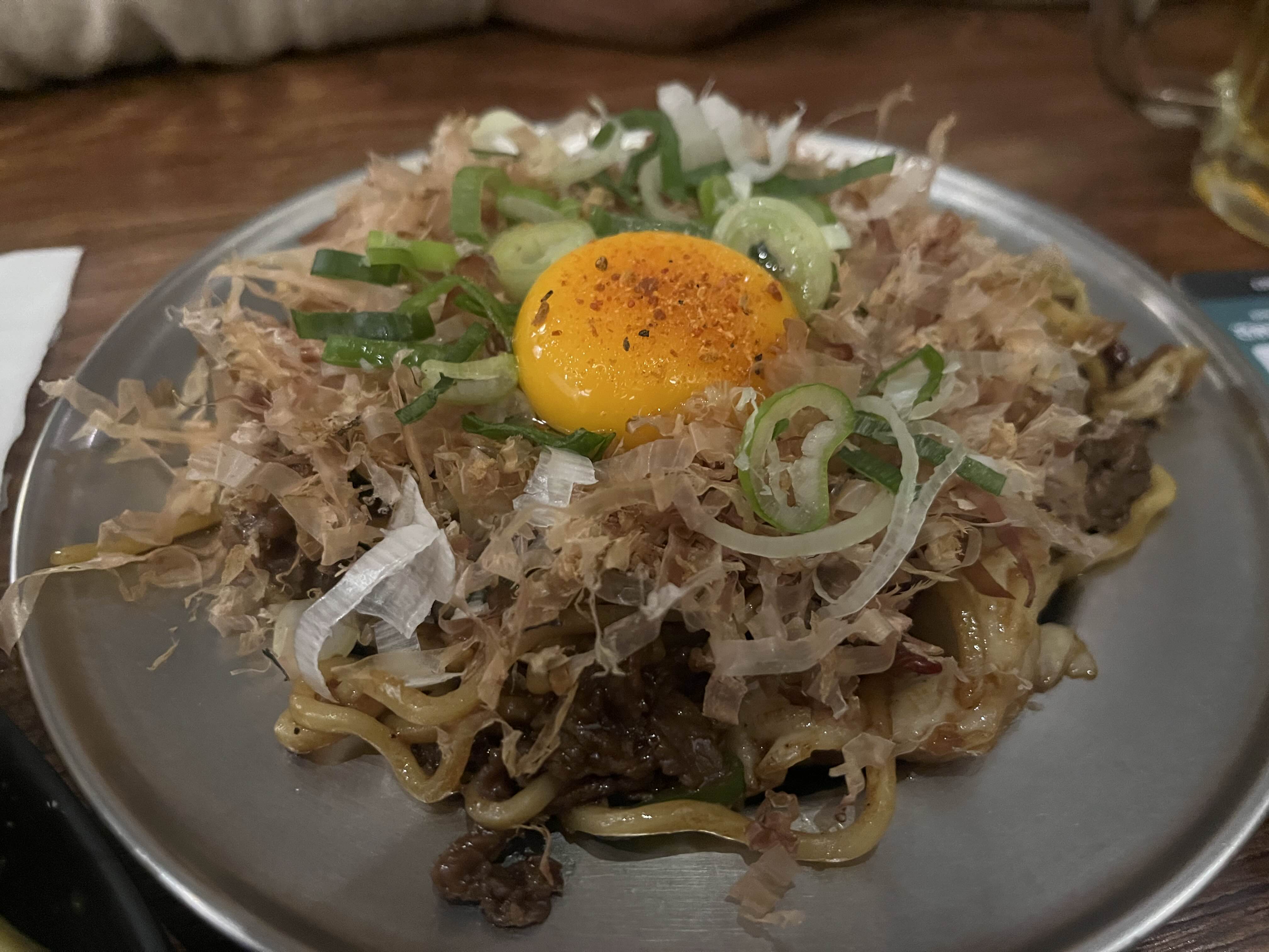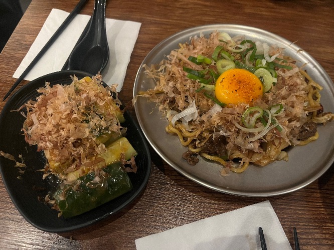 미소오이는 예상과는 다르게 달다는 느낌이 강했지만 다른 메인안주가 매콤하거나 자극적이라면곁들여 먹기 좋은 반찬 느낌이었어요.그래서 맵다는 표시가 되어 있는 소고기 야끼소바를 시켜보았는데요.