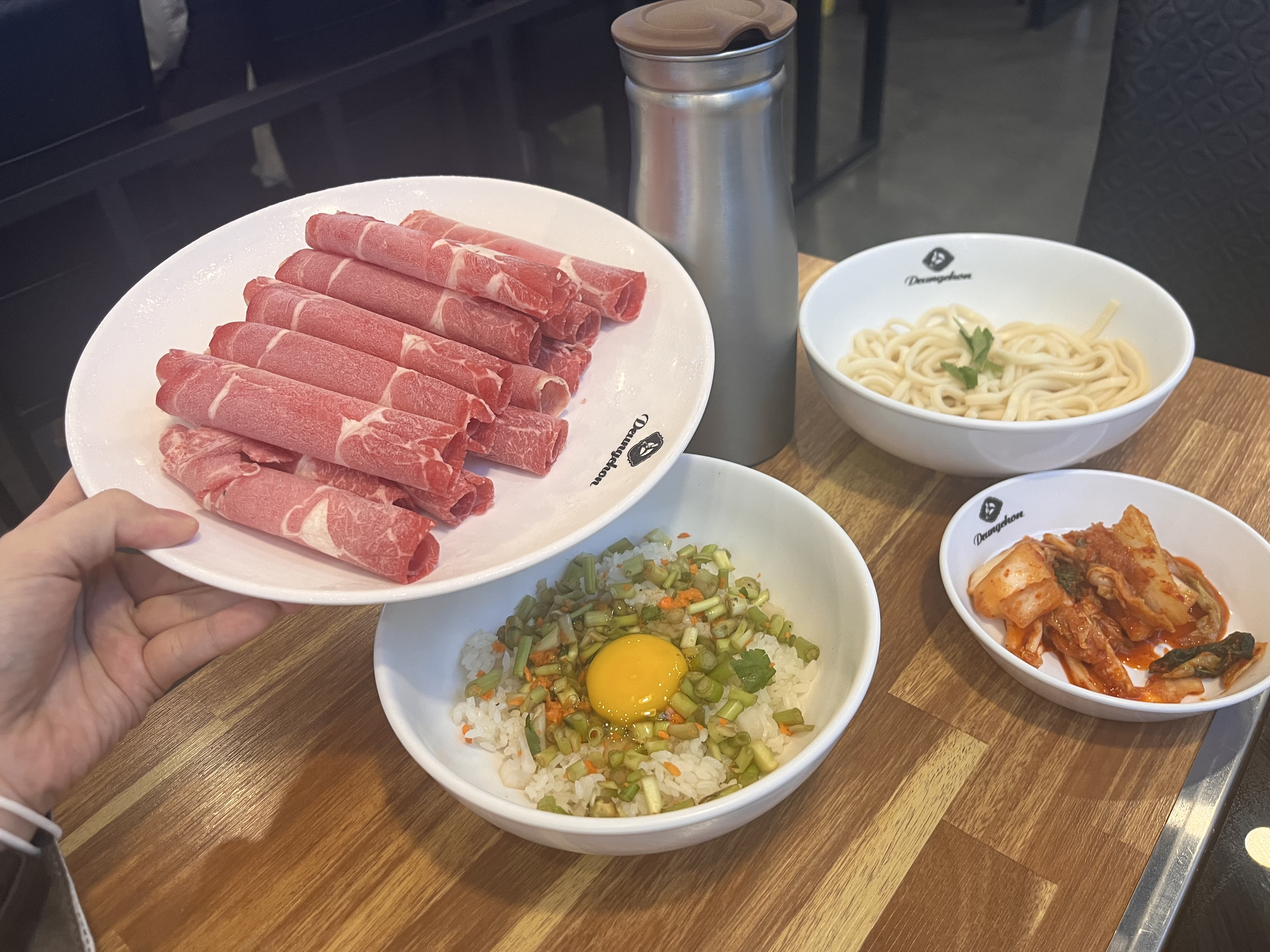 육수에 야채가 담겨져서 나오고, 샤브샤브용 소고기, 칼국수면, 볶음밥재료가 함께 세팅됩니다. 야채육수를 끓이면서 어느 정도 야채들이 풀이 죽으면, 그때부터 고기를 담가서 익혀 먹어요. 고기를 다 먹고 나면 면을 넣어서 칼국수로 먹고, 그것도 다 먹으면 직원에게 말해서 볶음밥을 해달라고 해요. 그럼 전골냄비를 가져다가 볶음밥을 해서 갖다주더라구요.