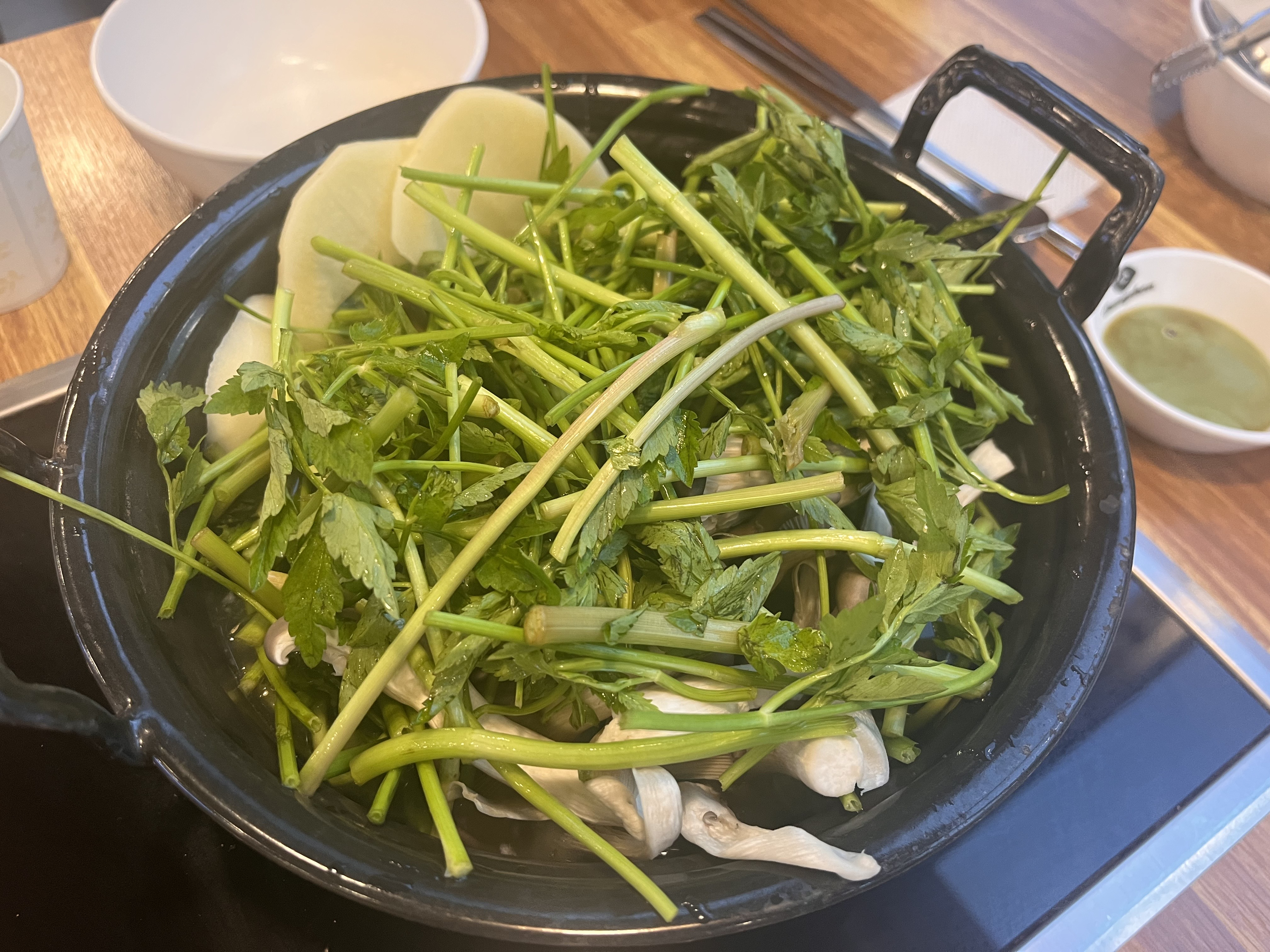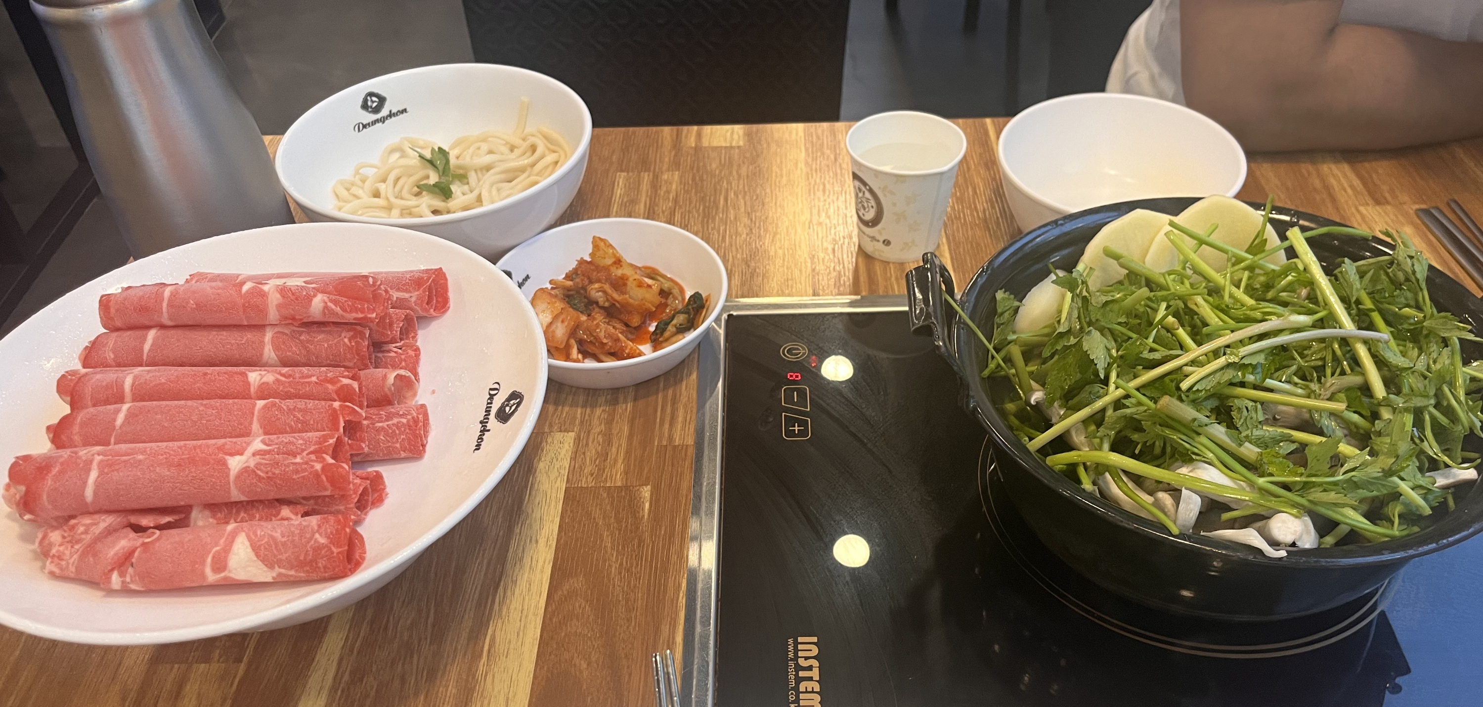 말로는 샤브, 칼국수, 볶음밥 다 즐길 수가 있어서 가성비가 있다는 느낌으로 말하고 있는데, 결과적으로 딱히 맛있다거나 가성비가 좋다는 생각은 안 들었어요. 그도 그럴것이, 야채가 미나리만 가득이고, 나머지는 버섯 조금이랑 감자슬라이스 두 조각 나오던데 구성이...; 미나리를 진짜 너무 좋아하는 사람 말고는 다 만족하지 못하지 않을까요? 그런 거 치고는 중년이나 가족 손님이 꽤 많긴 하던데, 고기도 야채도 그냥 그랬고, 칼국수도 육수가 너무 쫄아서 그런지 짰고.. 볶음밥은 싱거웠어요. 고기까지 합쳐서 만원이면 갈 거 같은데, 지금 가격으로는 별로 만족스러운 식사는 아니었습니다.
