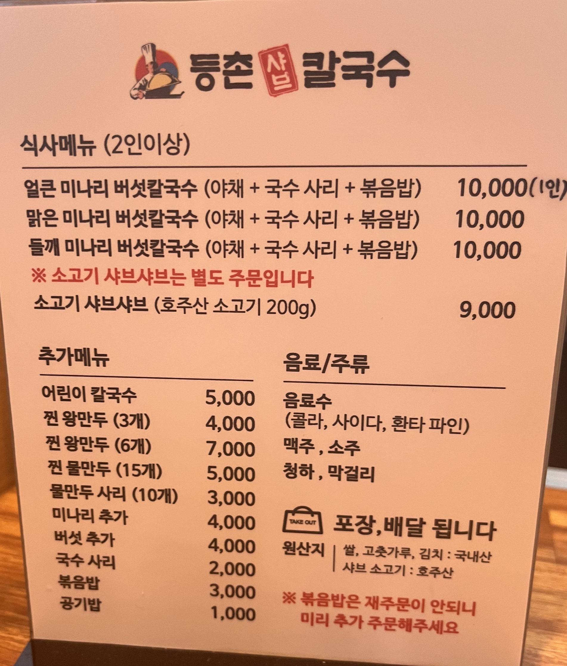 [등촌 샤브 칼국수]라는 이름만 보면, 샤브샤브도 팔고 식사메뉴로 칼국수도 파는 건지, 칼국수만 파는데 고기를 넣어준다는 건지 이해가 잘 안 되었었어요. 그래서 직원에게 물어보니 식사메뉴인 버섯칼국수 중 한 종류를 고르고, 고기도 드시고 싶으시면 별도주문해야 된다고 하더라구요. 김치는 셀프추가!