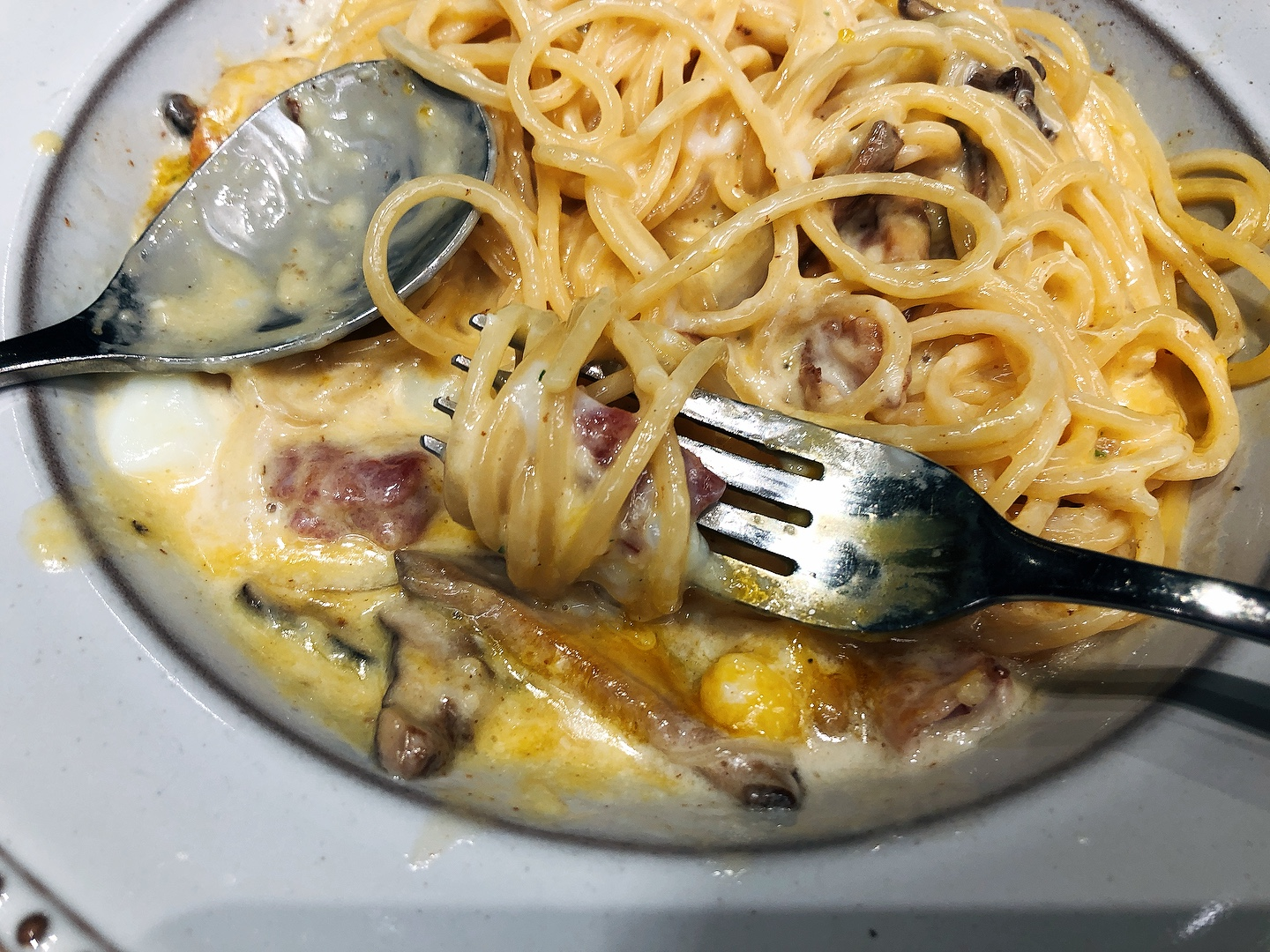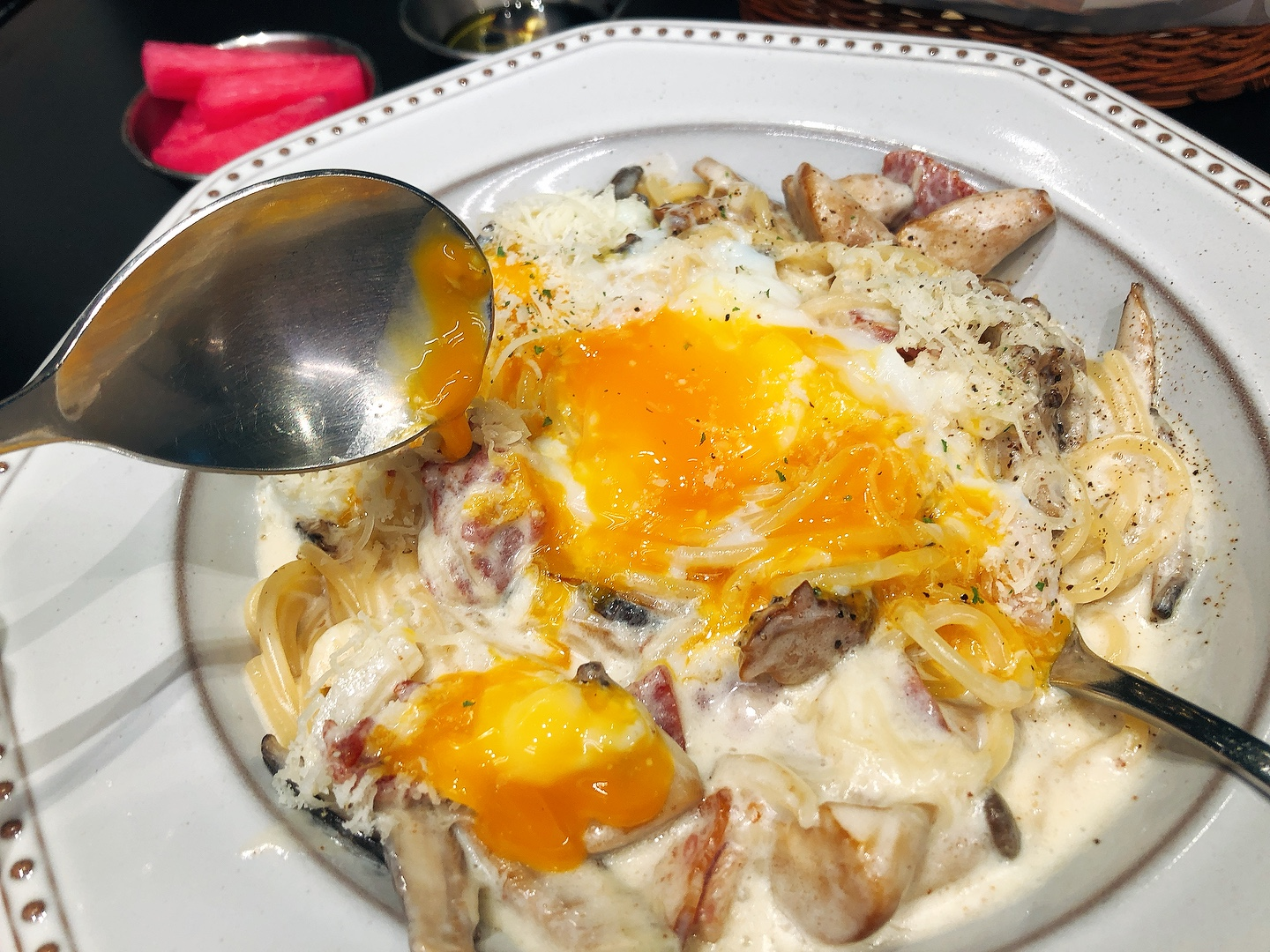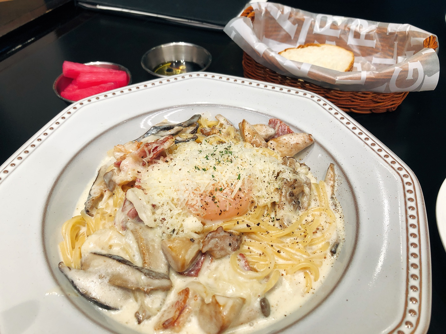 주문하니까 몇 분 뒤에 식전빵이 먼저 나왔어요. 제대로 된 이탈리안 음식점에서 파스타를 먹는 게 오랜만이라서 그런지 식전빵을 보고 감회가 새롭더라구요. 빵도 부드럽고 올리브오일에 찍어서 먹었더니 고소해서 맛있게 먹었습니다. 그리고 까르보나라는 딱 제가 원하는 스타일이었던 거 같아요. 수란을 터뜨려서 같이 버무려서 먹는 스타일이라서 꾸덕하고 진한 것이 완전히 제 취향이었어요.