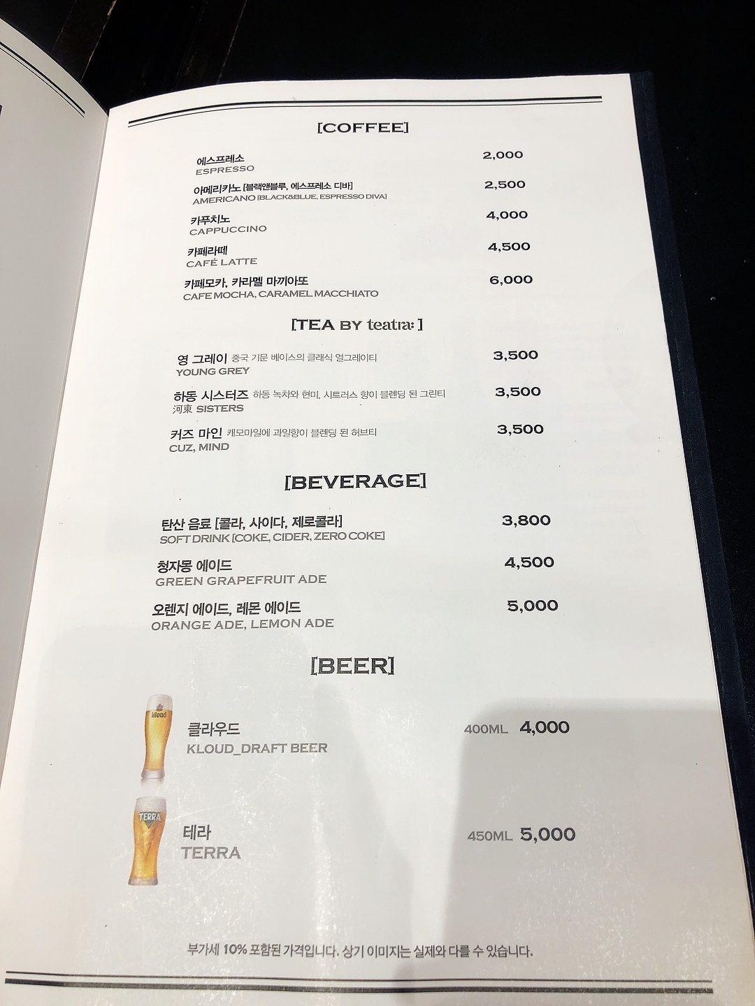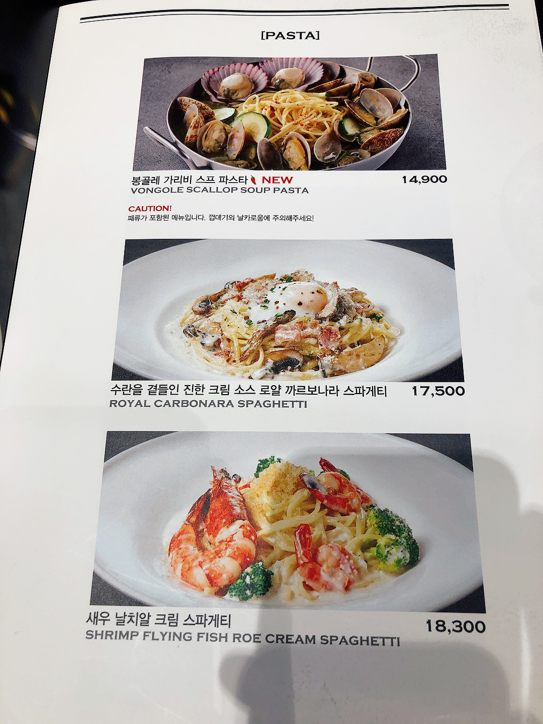 그리고 무엇보다 메뉴판에 나와있는 파스타 메뉴들이 매우 맛있어보였어요. 메뉴를 보니 파스타 이외에도 여러 가지 디저트와 커피, 스테이크와 피자 등도 있어서 꼭 파스타가 아니더라도, 바처럼 와인을 마시거나 카페처럼 디저트와 커피를 즐기거나 할 수 있는 곳 같았어요. 그렇게 저는 수란을 곁들인 진한 크림 소스 로얄 까르보나라 스파게티(17,500)와 스테이크 머쉬룸 크림 뇨끼(19,900)를 주문했습니다.