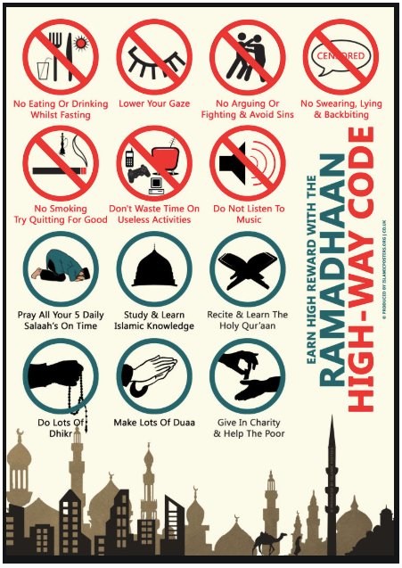 "해 뜰 때에만" 뭘 안 먹으면 된다고 생각해서 금식이 끝난 뒤 저녁과 해뜨기전 새벽에 고칼로리 음식 섭취로 과식 및 폭식하는 경우도 흔한지라 언론이나 정부에서도 폭식을 자제하라는 캠페인이나 적당히 먹어서 건강관리를 해야 한다는 식의 기사를 많이 내놓기도 한다고 합니다. 라마단 기간에 유명한 식당은 저녁에 자리를 잡기도 힘들 정도라네요.