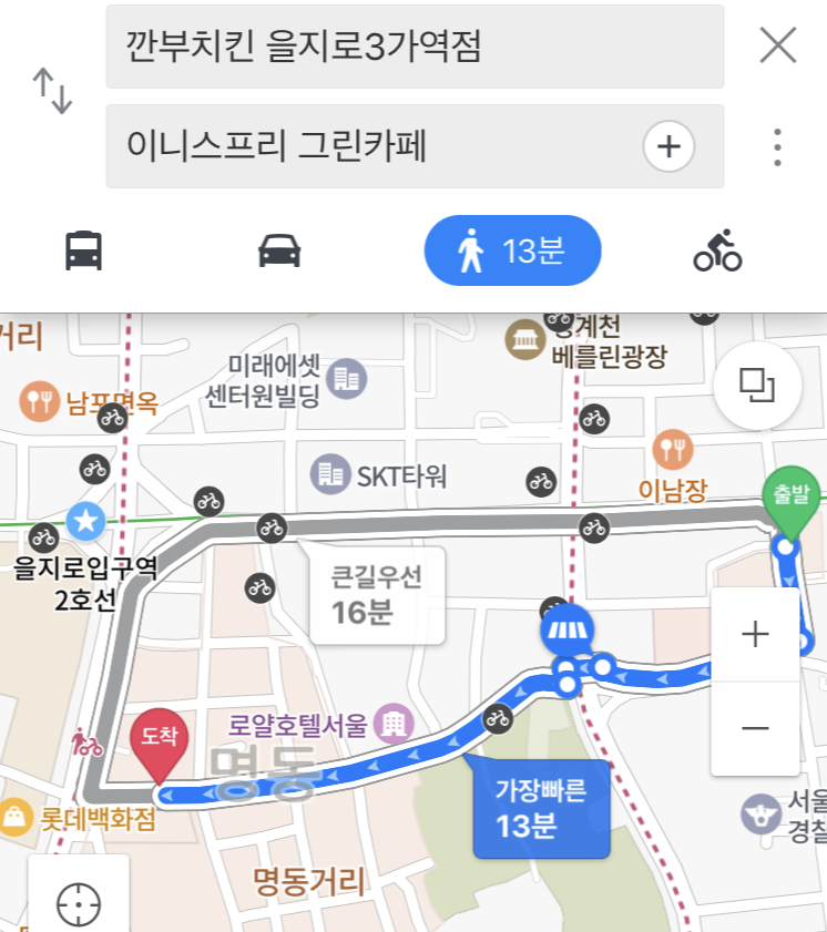 저희는 깐부치킨 을지로3가역점에서 저녁을 먹고 이니스프리그린카페를 가던 중이었는데요,