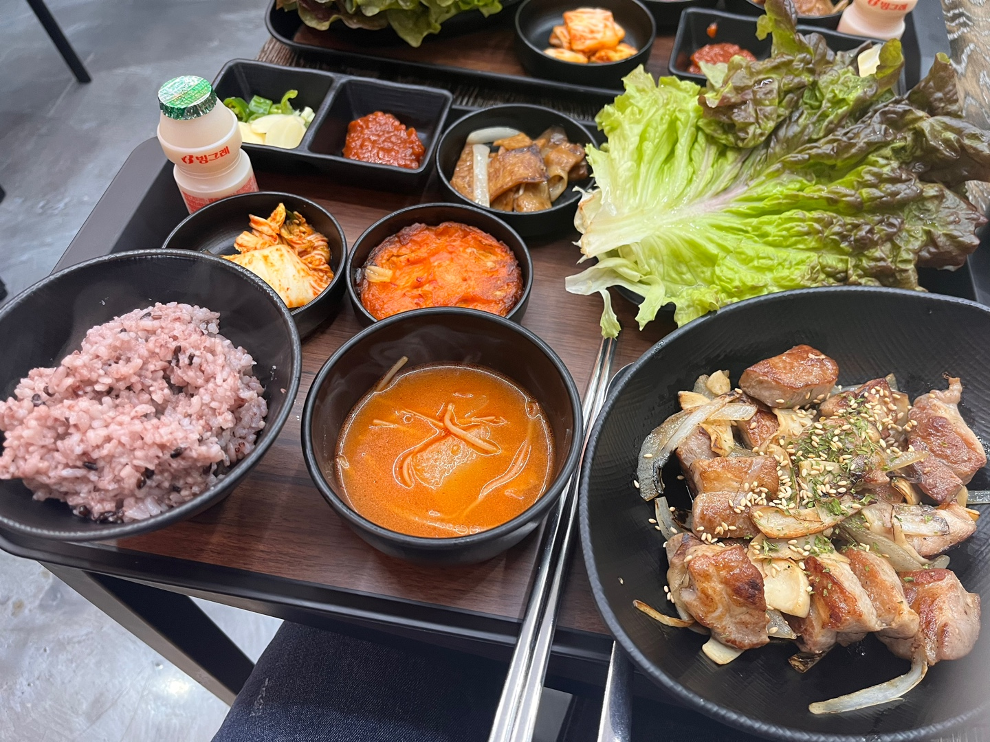 가게는 작은데, 점심시간에 보면 인기가 많아서 촘촘한 테이블들이 꽉 차요. 아마도 센스있는 밥상 때문인 거 같은데요. 주변에 반찬 잘 나오는 백반집이라고 하면 잘 없는데, 그럴 땐 여길 가면 될 거 같아요! 메인메뉴는 김치찌개 정식?이지만, 직화구이 정식 메뉴도 있어요. 메뉴를 고르면 그에 맞춘 국, 반찬, 계란찜이나 전 등이 함께 나오고, 셀프코너에 가시면 양배추 샐러드도 있더라구요! 영양 골고루 드시기 위해서는 양배추 샐러드도 드시는 거 잊지 마세요! > < 요구르트도 후식으로 센스!