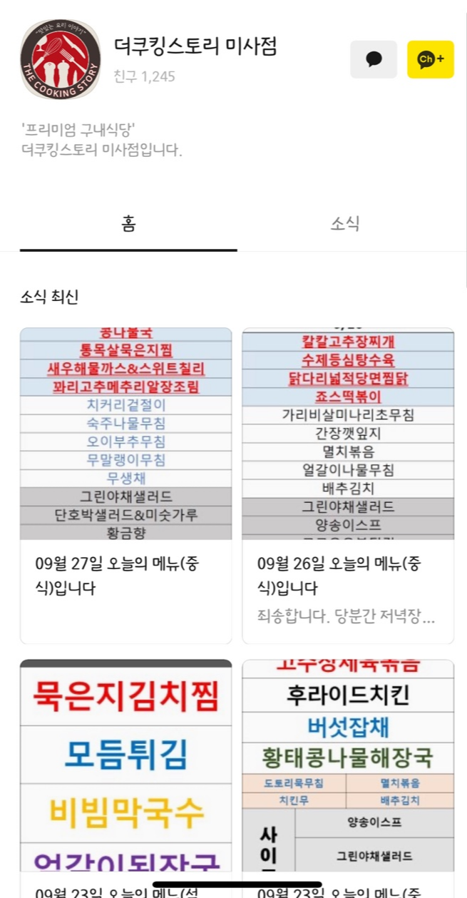 카카오톡에서 [더쿠킹스토리] 검색하면 미사점이 나오는데 친구추가 하지 않아도 채널에 들어가서 메뉴가 뭐가 나오는지 알 수 있어요. 그래서 먹고 싶은 메뉴가 있는 날만 갈 수 있고, 매일 무슨 메뉴가 나오나 한 번씩 검색해보는 재미가 있더라구요. 예전엔 메인메뉴만 알려줬었는데, 풍성하게 바뀐 후에는 사이드메뉴까지 다 알려줘요. 사이드메뉴도 스프, 샐러드, 떡, 빵, 샌드위치, 파스타샐러드 등 여러 메뉴가 돌아가면서 나와서 이제는 진짜 뷔페다워진 거 같아요. 가끔 나오는 미숫가루가 너무 맛있어요😍 앞으론 더 자주 가게 될 거 같아요!!
