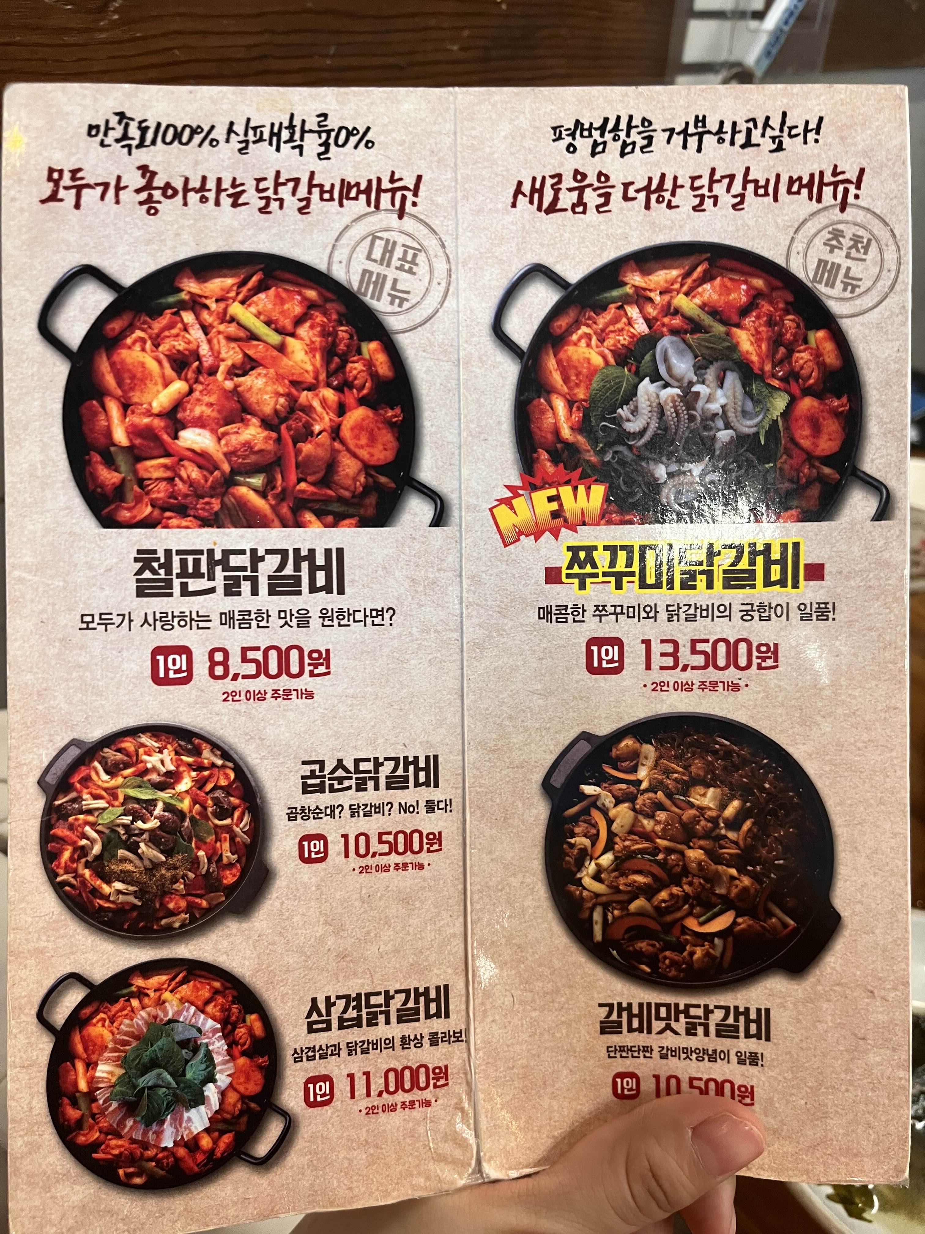 닭갈비가 제일 유명한 메뉴인 강촌식당! 하지만 잘 살펴보면 다른 맛있어보이는 메뉴가 많은데요. 항상 닭갈비에 치즈 추가해서 먹다가 매운 게 땡기던 어느날, 미사센텀비즈 주변에는 그닥 매운 음식이 없네 하고 있었는데, 강촌식당에 쭈꾸미닭갈비라는 메뉴가 있더라구요! 치즈는 굳으면 안 먹게 되서 패기 있게 치즈도 추가 안하고 쭈꾸미닭갈비에 우동사이 추가해서 주문했어요😊