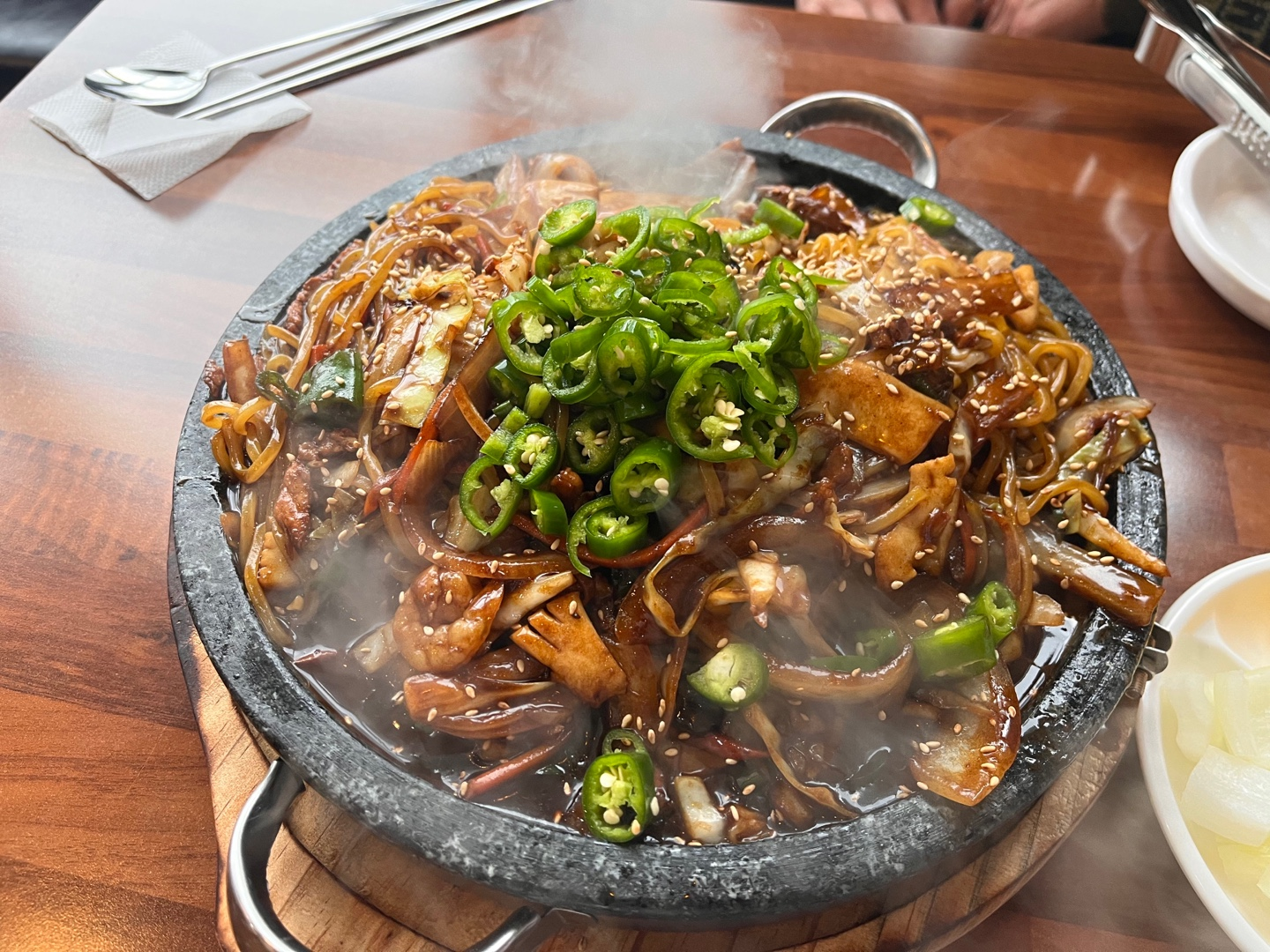 그리고, 뭔가 이 돌판에서 나는 냄새 같은데 춘장이 타서 나는 냄새 같기도 하고 그 냄새가 약간 역했어요.
