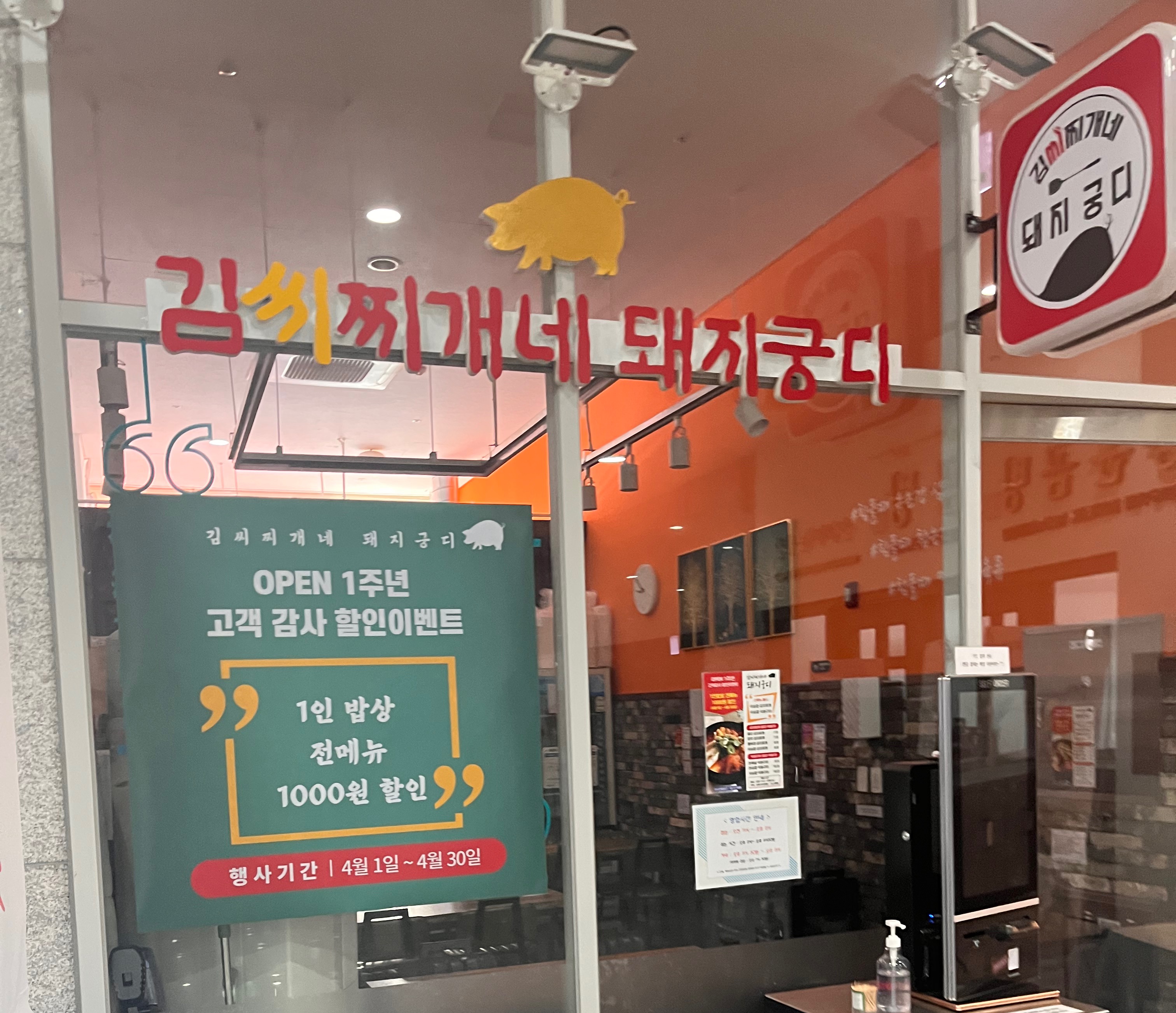 그리고 사미반점 옆에 있는 돼지궁디 김치찌개집도 4월동안 전메뉴 천원 할인이래요! 원래도 반찬과 국이 충실히 나오는 가성비 정식 집인데, 천원할인까지 해준다니 넘나 감사한것😍