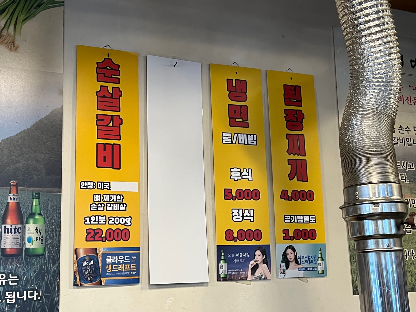 메뉴는 무척 단촐했어요. 순살갈비랑 뼈가 붙어있는 갈비종류 이렇게 두 종류 있었다고 하는데 뼈 있는 갈비는 잠시 판매하고 있지 않다고 했어요. (곧 다시 재개할 예정이라고 함) 그 외에는 냉면과 된장찌개가 있었구요. 그래서 순살갈비 2인분과 된장찌개를 주문했습니다. 갈비가격은 미국산이라서 그런지 다른 양념소갈비보단 훨씬 저렴한 편?
