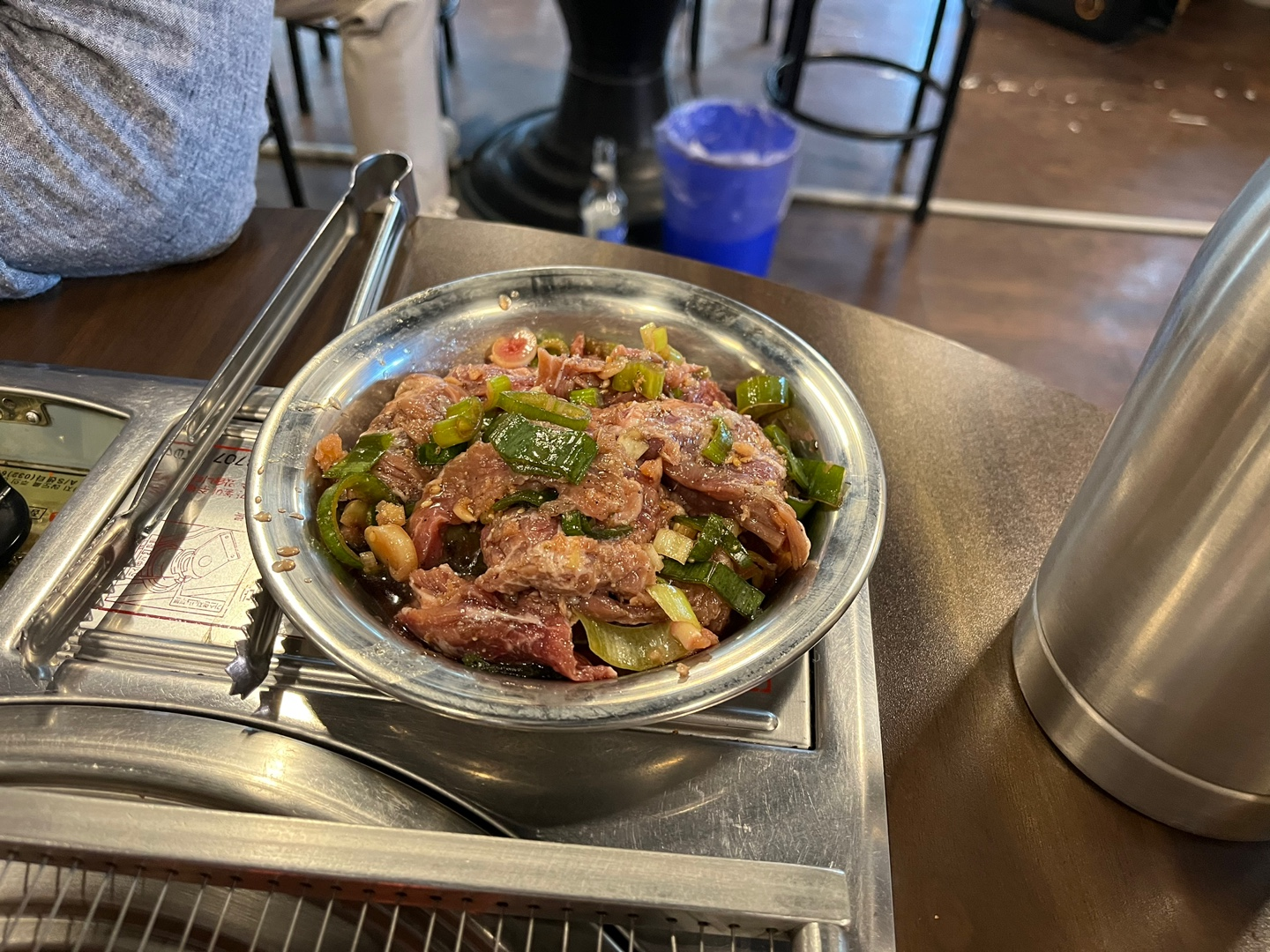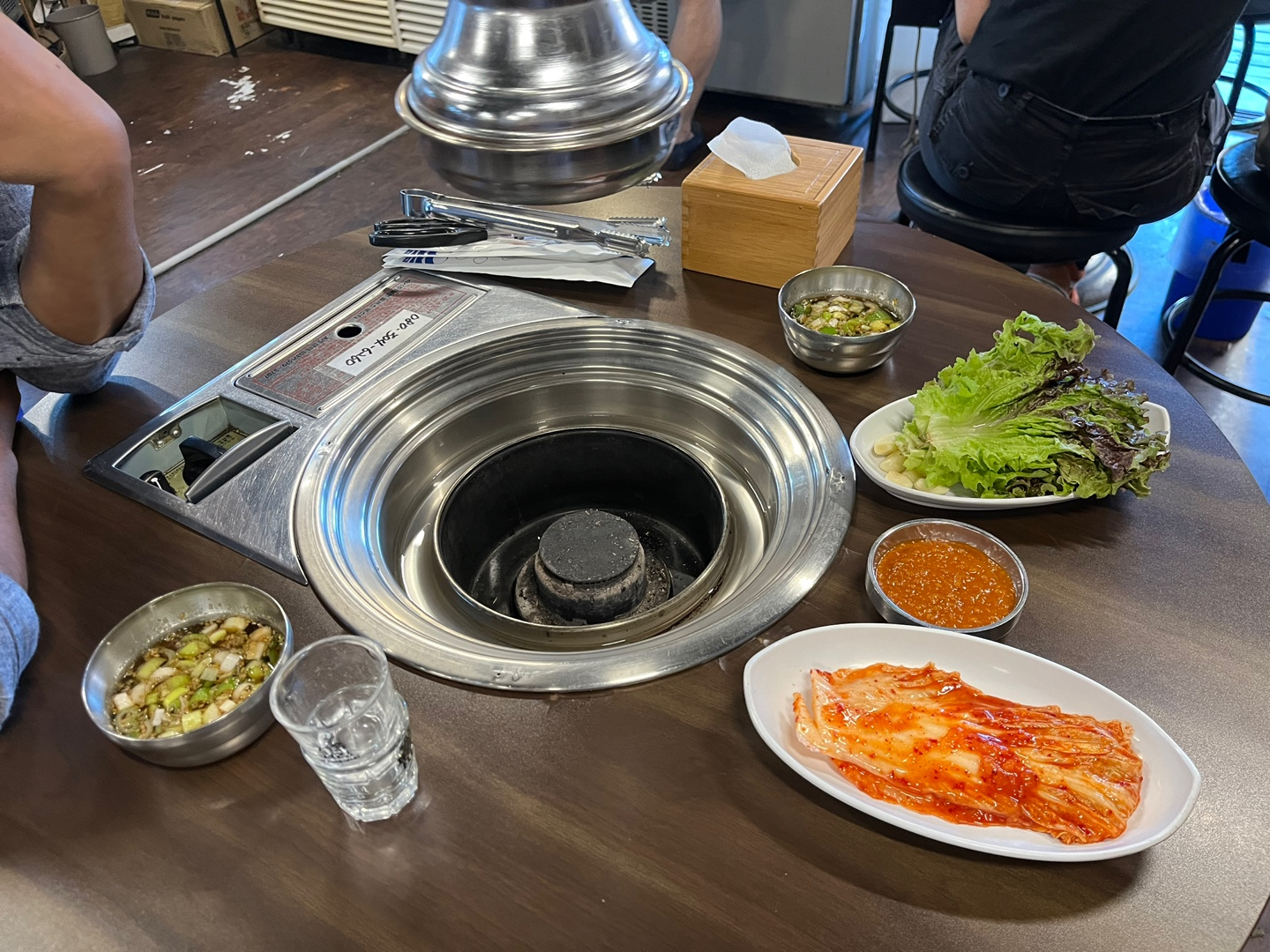 그래도 배추김치도 맛있었고, 간장소스는 고기를 절일 때 쓴 소스와 같은 소스인 거 같았지만, 거기에 청양고추와 마늘을 넣어 고기와 함께 끓여서 먹는 매운 소스도 함께 주더라구요. 큰 차이는 없었지만 안에 들어있는 청양고추와 마늘이 한숨 끓여진 후에 쌈에 넣어 먹으니까, 생고추와 생마늘을 못 먹지만 구워먹는 저에게는 좋았던 거 같아요.
