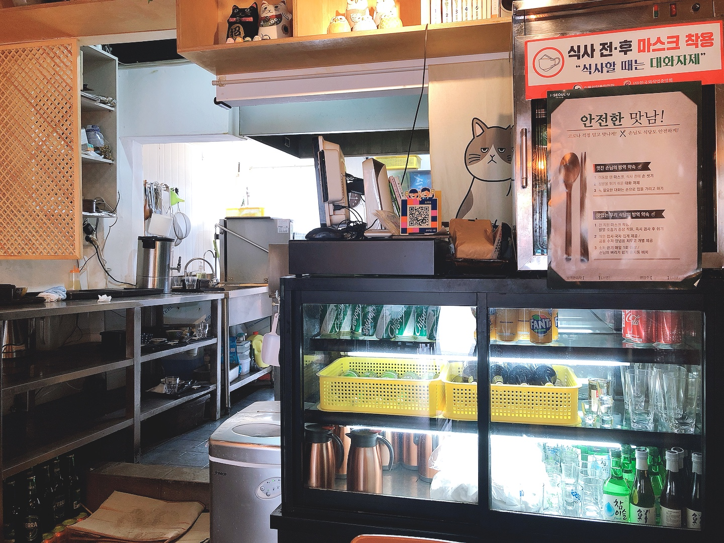 왼쪽 사진에 주방이 살짝 보이는데, 사장님이 거기서 요리도 하시고 설거지도 하시고 보기만 해도 엄청 바빠보이세요. 그래서 원래부터 빈그릇을 손님이 반납해야 하는건지 바쁜 사장님이 안쓰러워서 손님들이 직접 반납하는건지는 모르겠지만 손님들이 보통은 빈그릇과 쟁반을 홀 쪽으로 나와 있는 씽크대 부분에 반납하고 가더라구요.