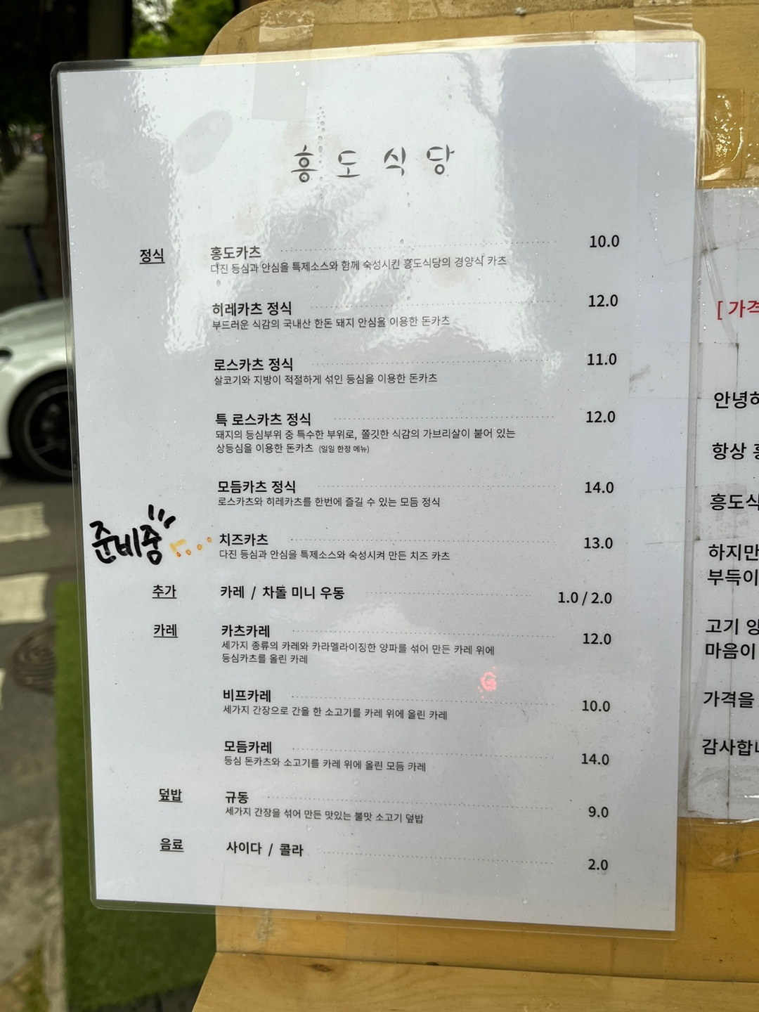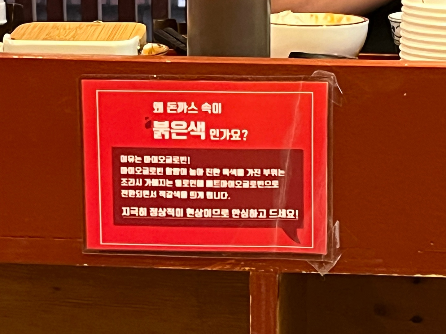 5시부터 저녁 영업이 시작되는데, 좀 일찍 도착해서 앞에서 기다리면서 메뉴를 정했어요. 엄마와 저는 둘다 로스 취향이지만, 오늘은 처음 온 거니까 두 가지 다 먹어보려고 특 로스카츠 정식(12,000)과 히레카츠(12,000) 정식, 그리고 곁들여먹는 카레도 사이드메뉴에 있길래 시키기로 했어요. 가격은 기존 돈카츠집들에 비해 저렴한 편이라고 생각됩니다. 특이했던 것은 특 로스카츠가 양이 많거나 고기 원산지가 좋아서 특이 아니고, 로스에 가브리살이 붙어 있는 고기를 돈카츠로 만들었다는 점이었는데요. 가브리살이 입에서 녹는다는 리뷰를 보고 요걸로 주문했습니다. 나중에 가게로 들어가니 좌석에서 잘 보이는 곳 몇 군데에 사진의 빨간색 설명판?이 붙여져 있던데, 아마도 질문하는 사람들이 많았나봐요. 덕분에 저도 새로운 지식을 하나 얻게 되었습니다 !:)