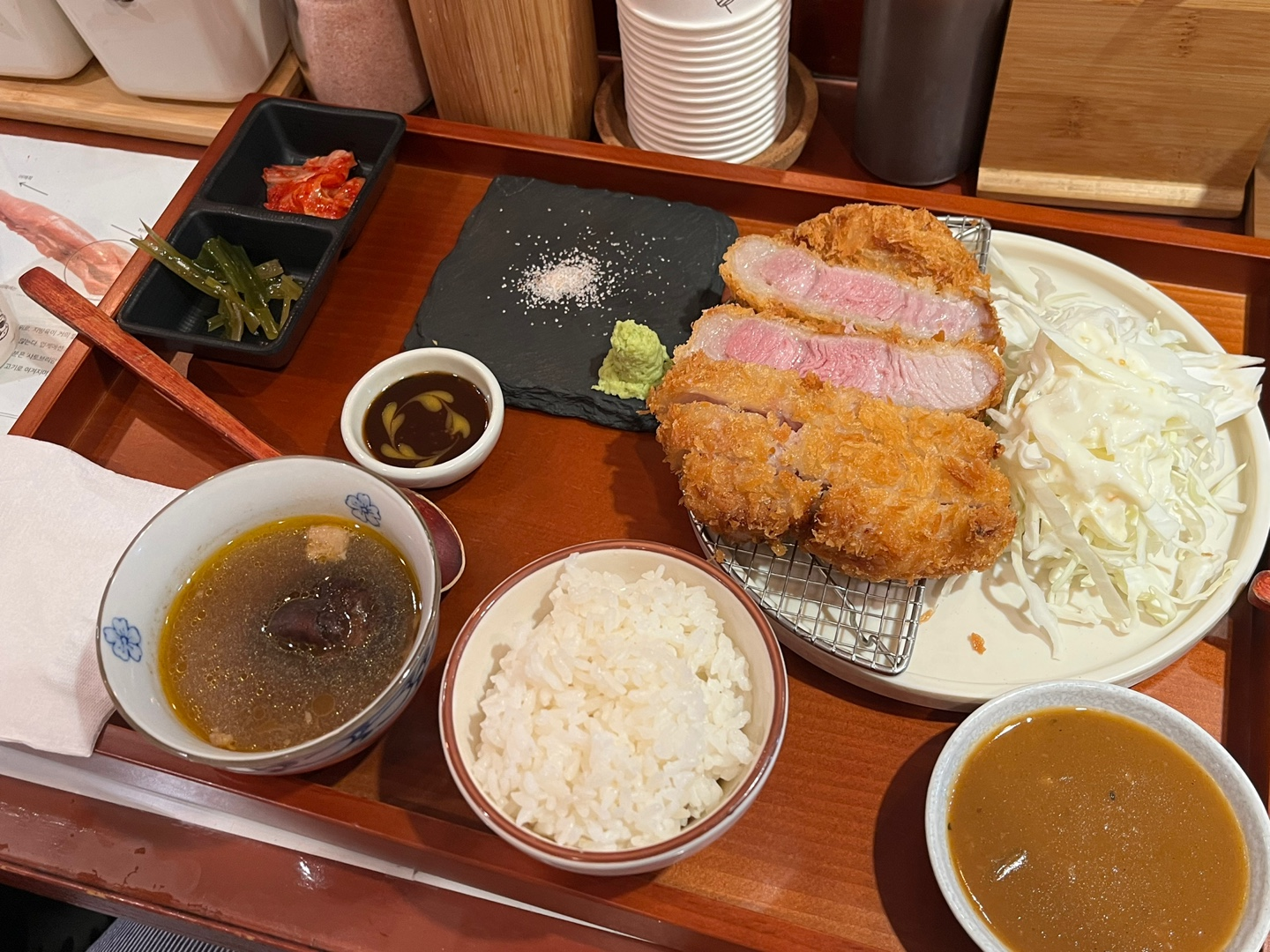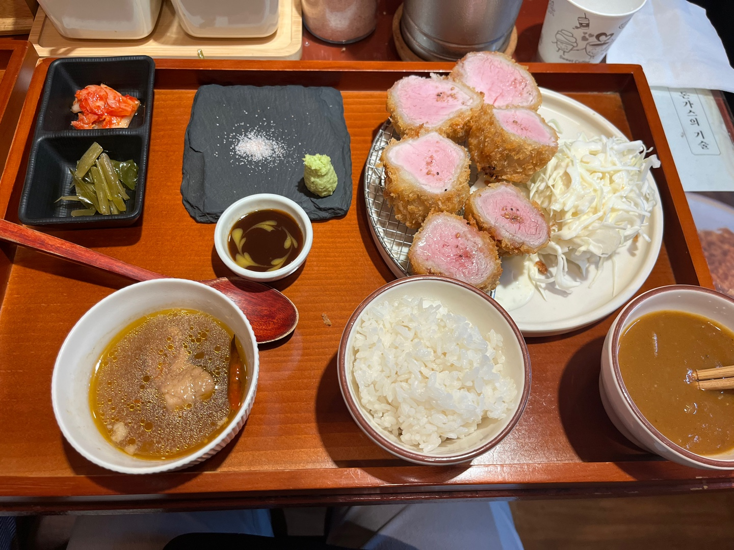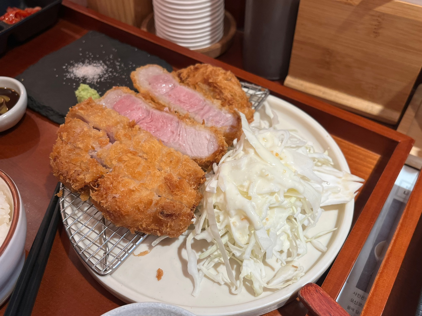 돈카츠 자체에는 엄마도 저도 만족했어요. 적당히 씹는 맛도 있으면서 풍부한 육즙과 두툼하면서도 부드러운 고기가 훌륭합니다! 타즈무라와 비교하면 타즈무라가 위이긴 하지만, 가격적인 면에서 반값 밖에 안 되는데 이 정도 맛이라면 가성비는 충분하다는 생각이 듭니다. 다만, 가브리살이 들어간 특 로스카츠는 호불호가 있을 것 같아요. 저와 엄마의 경우, 기름을 먹는 것 같은 느낌이라서 약간 거북했어요. 히레카츠와 로스카츠 둘다 맛있었지만 다음에 가면 제 취향인 로스카츠를 시킬 것 같아요!