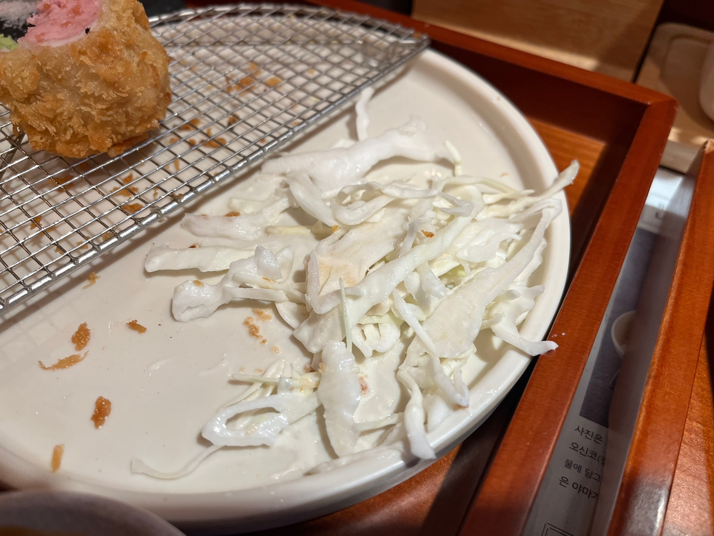 칼질이 서툰 제가 자른 거랑 비슷한 느낌이었어요. 우리나라 돈카츠전문점들도 양배추는 얇고 가볍게 쌓아올려서 이쁘게 나오기 때문에 양배추샐러드 좋아하는 엄마도 여기 양배추샐러드 별로라고 남기시더라구요.