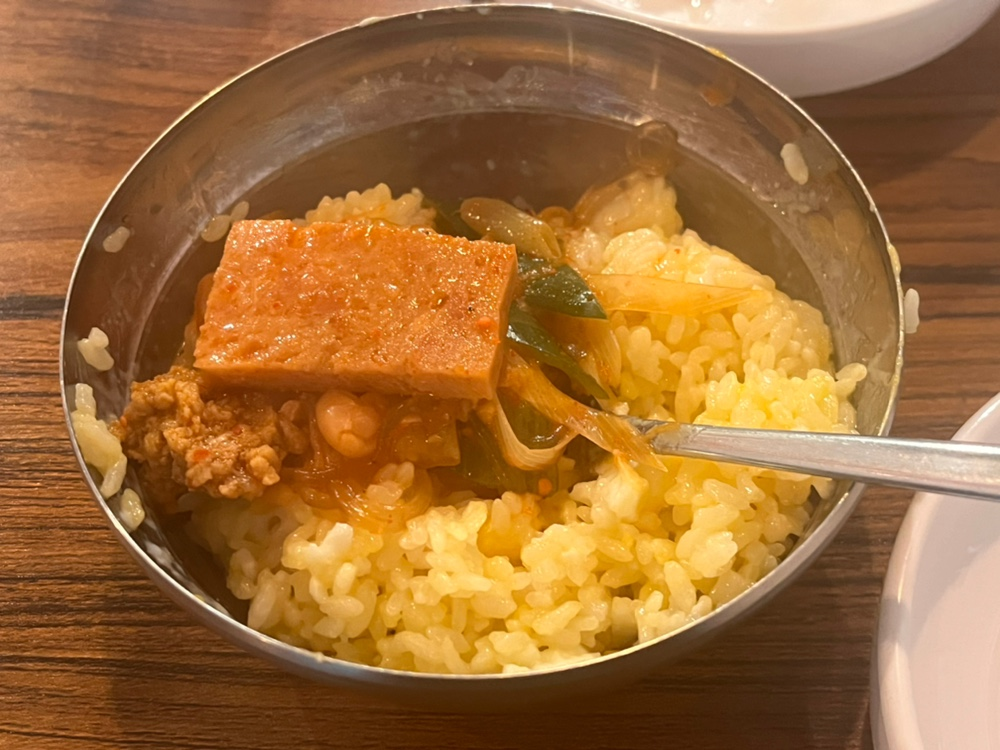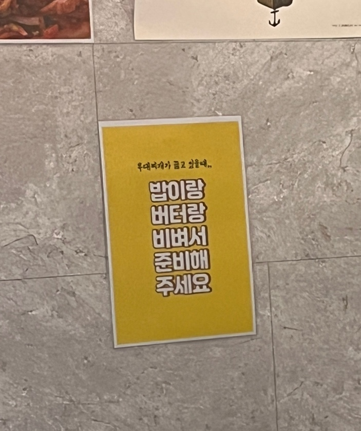 근데 부대찌개를 끓이는 도중에 주변을 둘러보다가 발견했는데, "밥이랑 버터랑 비벼서 준비해주세요"라고 써있더라구요. 이건 뭐지..? 사실 자리마다 버터가 배치되어 있는 것도 이건 대체 어디에 쓰는 것인고? 생각이 들긴 했는데, 반숙후라이밥이 식기 전에 버터를 비벼보았습니다. 고소한 향..! 신세계더라구요. 사장님께 여쭤보니, 예전엔 이렇게 주는 부대찌개집이 많았는데, 요즘엔 없어졌다고.. 자긴 어릴 때부터 엄마가 그렇게 해서 주셨었다고.. ! 배운 집안일세 ㅎㅎ