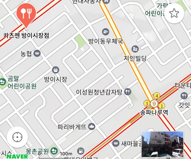 저는 지도에 보이는 파리바게뜨 있는 곳부터 걸어갔답니다. 한 10분 계속 걸어올라간 거 같아요. 방이시장이 꽤나 기네요.