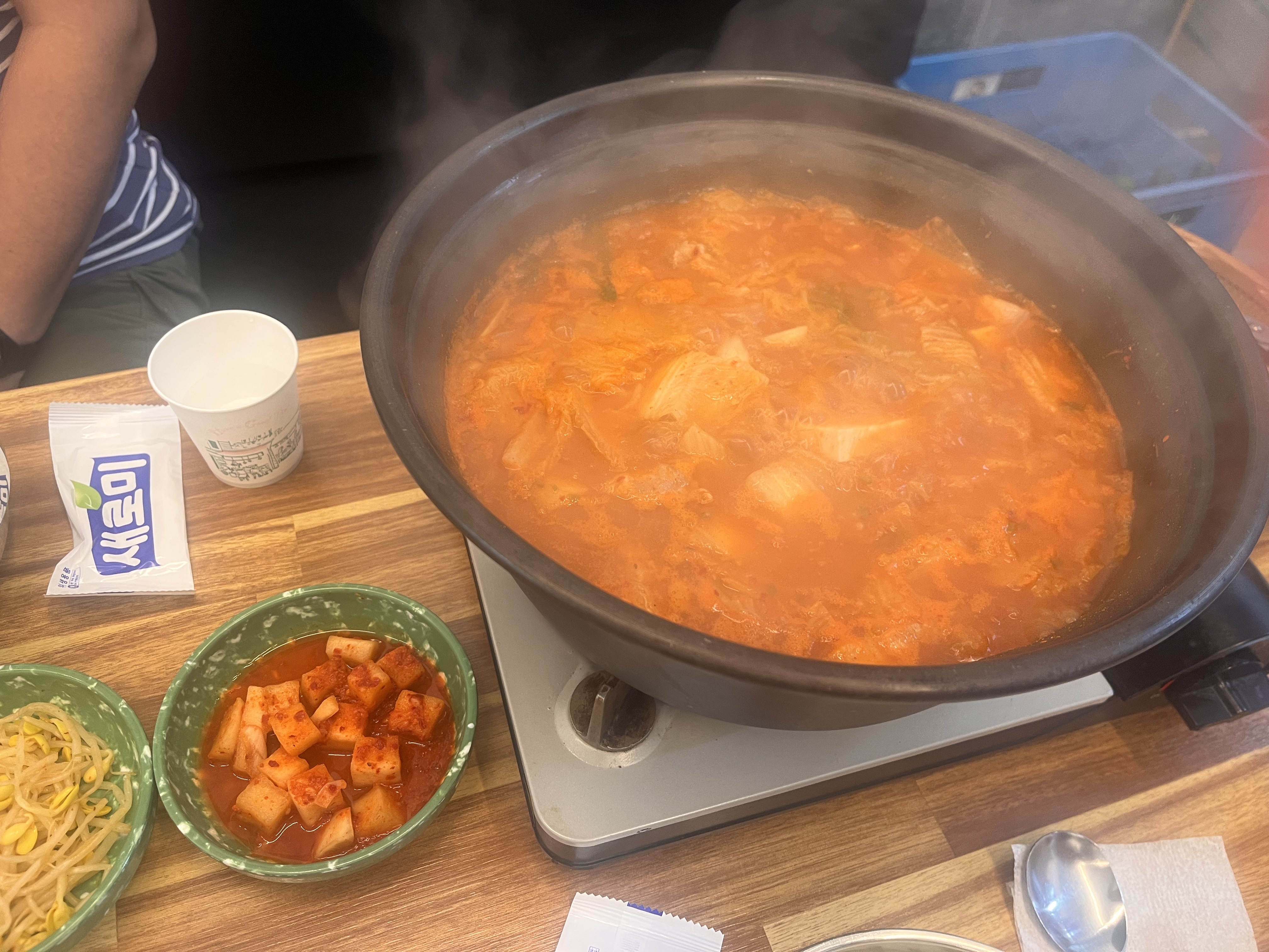 제가 여기 김치찌개를 좋아하는 이유는 돼지목살을 국내산 냉장육을 써서 잡내가 안 나고 고기가 정말 맛있다는 점, 그리고 고기 양이 어마어마하다는 점!(1명당 고기 2덩이 이상일듯)이 있구요. 그리고 시골에서 해먹는 김치찌개처럼 단맛은 줄이고, 김치와 돼지고기의 본연의 맛만을 살려 만들어서 자극적이지 않으면서도 후추의 칼칼한 맛으로 마무리되서 깔끔한 맛이 일품이라는 점인데요. 두루치기는 김치찌개에 비해 좀 자극적인 맛이었어요. 그것도 설탕을 많이 넣은 단맛이 주가 되는 맛이었어요~ 콩나물이 들어가서 좀 더 식감을 더했다는 장점이 있었지만 왜 1,000원이 더 비싼지는 잘 모르겠었다는.. 앞으로는 가면 김치찌개로만 통일해서 시킬 거 같네요~ 그리고 백채김치찌개는 점심 때 고봉밥과 라면사리가 무제한 공짜인데요. 여기만 가면 한 사람당 고봉밥이 나와서 제가 먹는 밥보다 훨씬 많이 먹게 돼요ㅋㅋ 공기밥 2그릇 정도의 양이라 배가 엄청 부릅니다. 하지만 그에 비해 소화는 잘되는 거 같아요! 그래서 해장으로도, 든든한 한 끼로도 추천드려요!