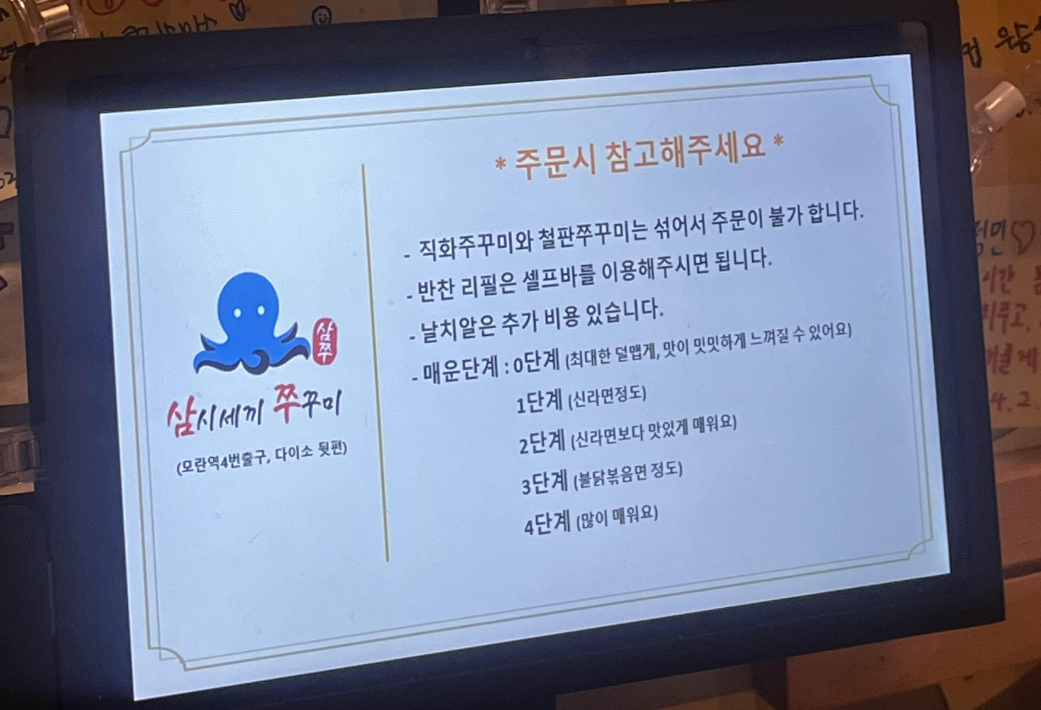 주문은 키오스크로 하게 되어 있고, 매운맛 단계에 대해서 자세히 설명이 나와 있어요.
