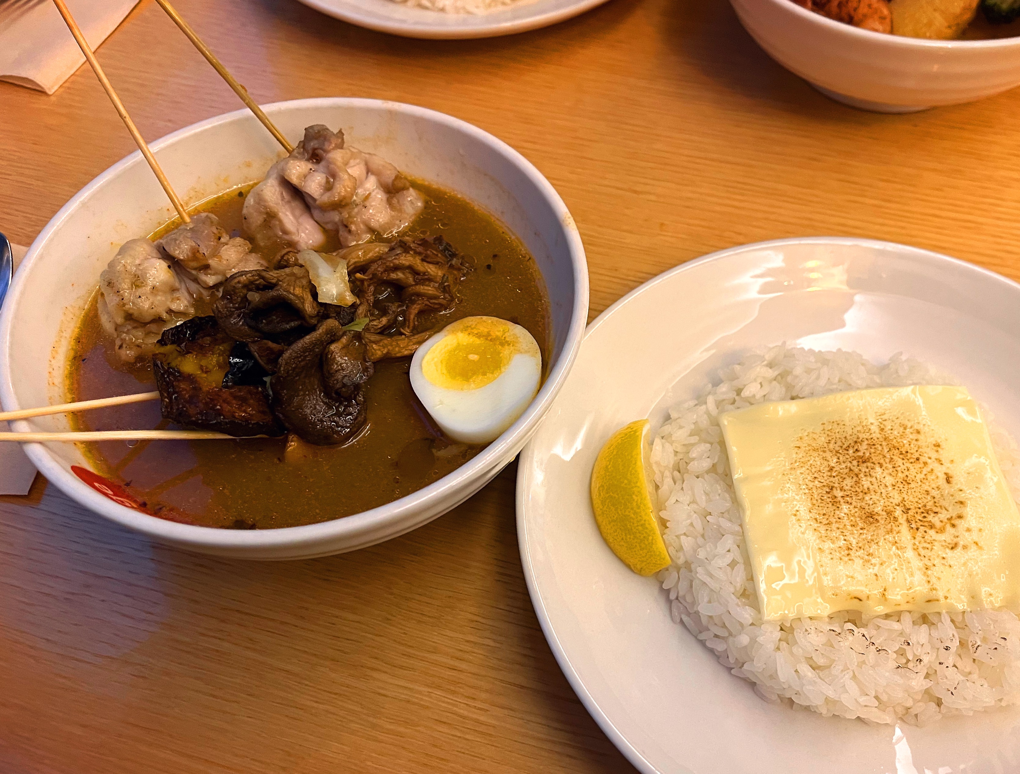 저는 치킨카레, 친구는 하와이안 카레를 시켰는데요. 와.. 치킨이 너무 맛있어서 놀랐어요. 뼈가 없는 순살치킨을 부드러우면서도 숯불향이 나게 잘 조리했더라구요. 삿포로에서 먹었던 스프카레보다 고기맛은 감히 한 수 위라고 말씀드릴 수 있겠습니다!! 😭감동!!! 그리고 야채류도 버섯, 감자, 가지 등 다 너무 맛있었고(단호박만 좀 별로였음, 노란 속살보다 초록색 껍데기 부분이 많아서 좀 썼던 듯) 제가 제일 좋아했던 브로콜리도 현지맛 그대로 딱 좋게 구워내셨더라구요!! 그리고 스프도 매운맛4단계(신라면)로 주문했는데, 역시 매운맛은 한국인가 싶을 정도로 칼칼한 맛이 일본보다 낫다고 판단되었습니다. 일본에선 맵게 시키면 넘 짜게