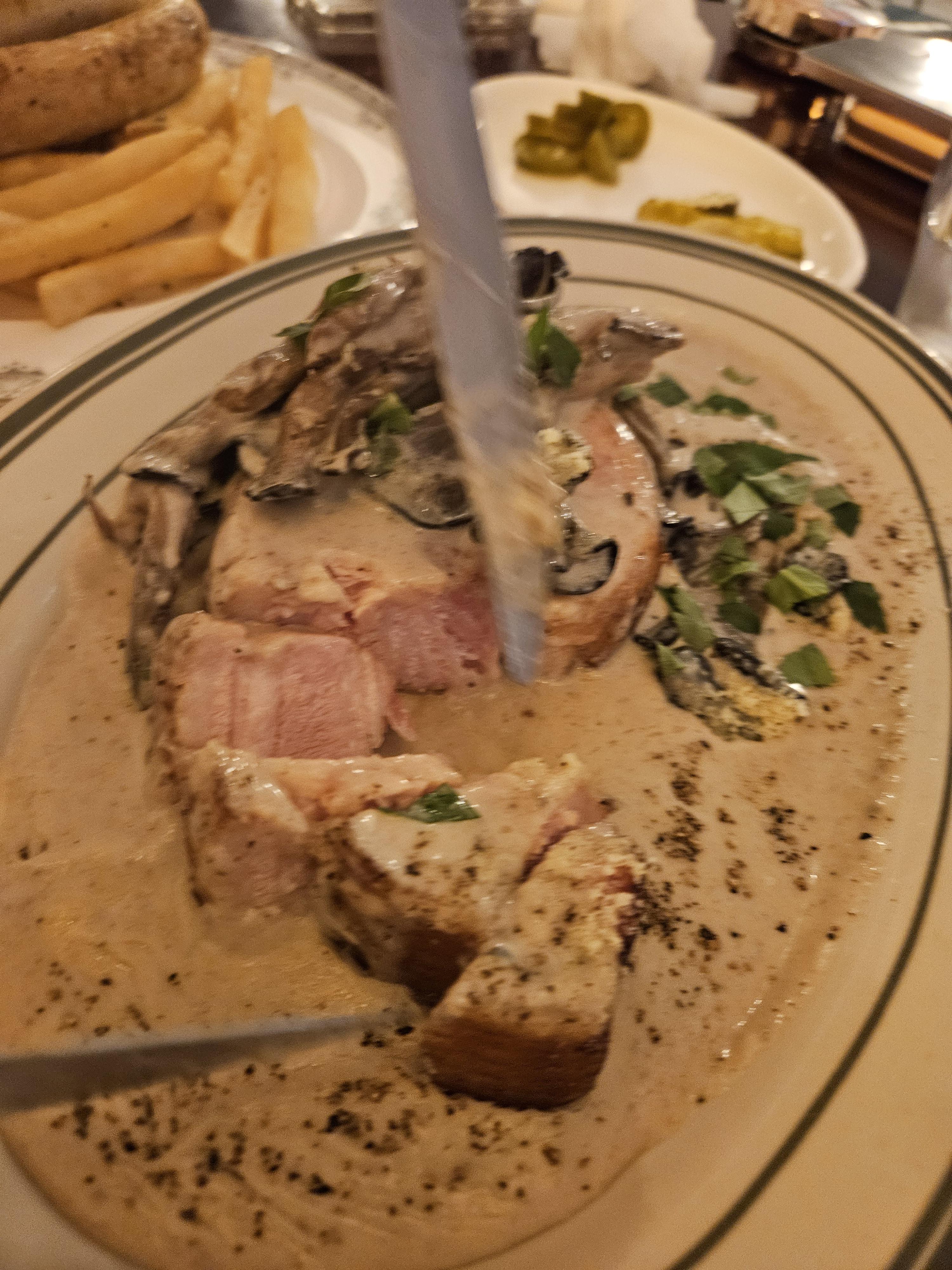 크림소스와 버섯에 파묻혀 있는 삼겹스테이크를 짤라보면 분홍빛 속살이 나오는데요.