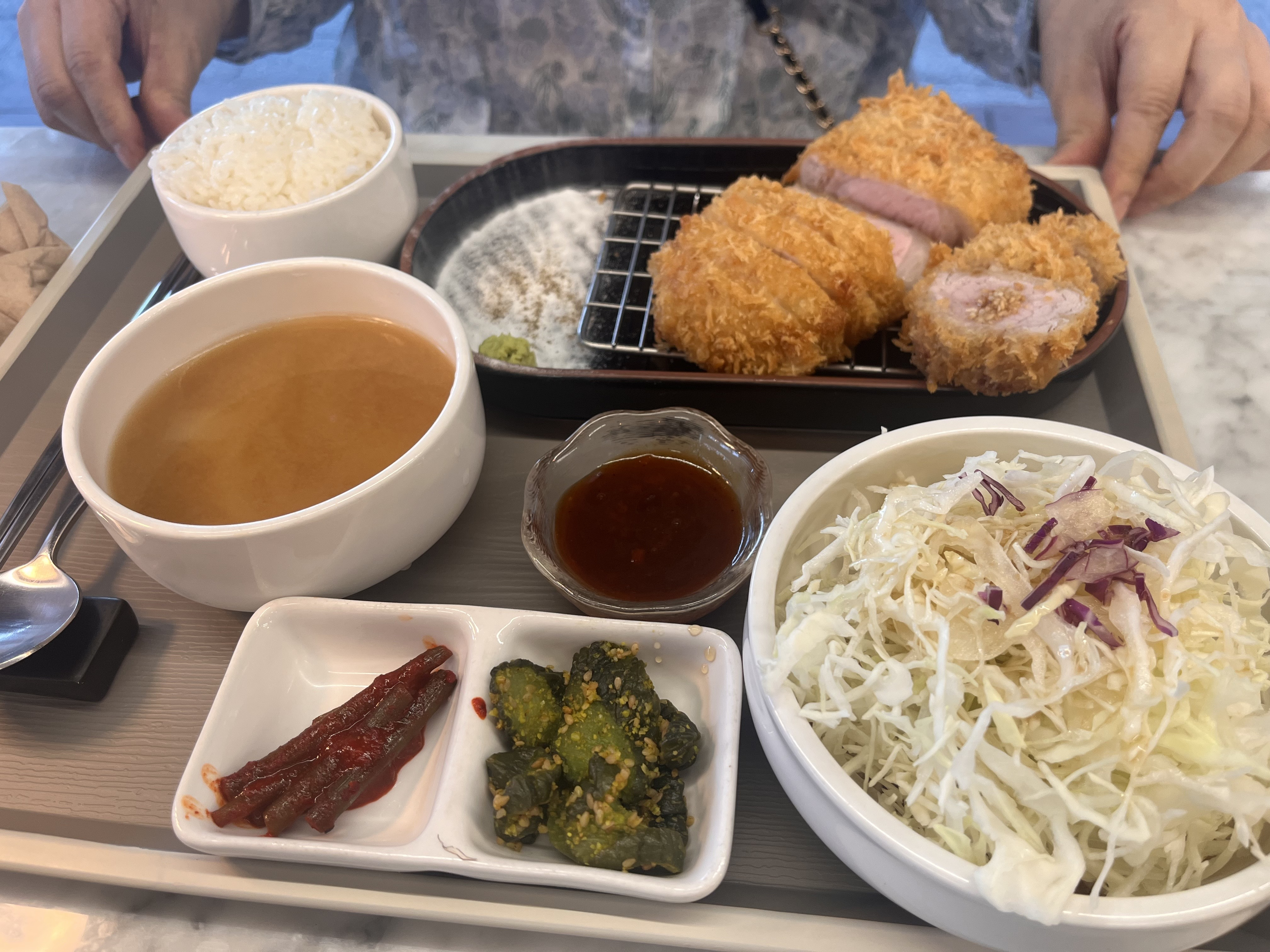 등심과 히레 때깔 좀 보세요. 다 윤기가 좔좔 흐르고, 튀김옷이 얇아서 다른 곳에서 먹어봤던 돈카츠들보다 느끼하지 않고 담백했어요. 식감도 부드럽고, 겉은 바삭해서 황홀...! 아마 시장이 반찬이라고, 저희가 많이 배고팠던 상황이 더 맛있게 먹을 수 있게 해줬던 것도 있겠지만, 진짜 맛있더라구요!!