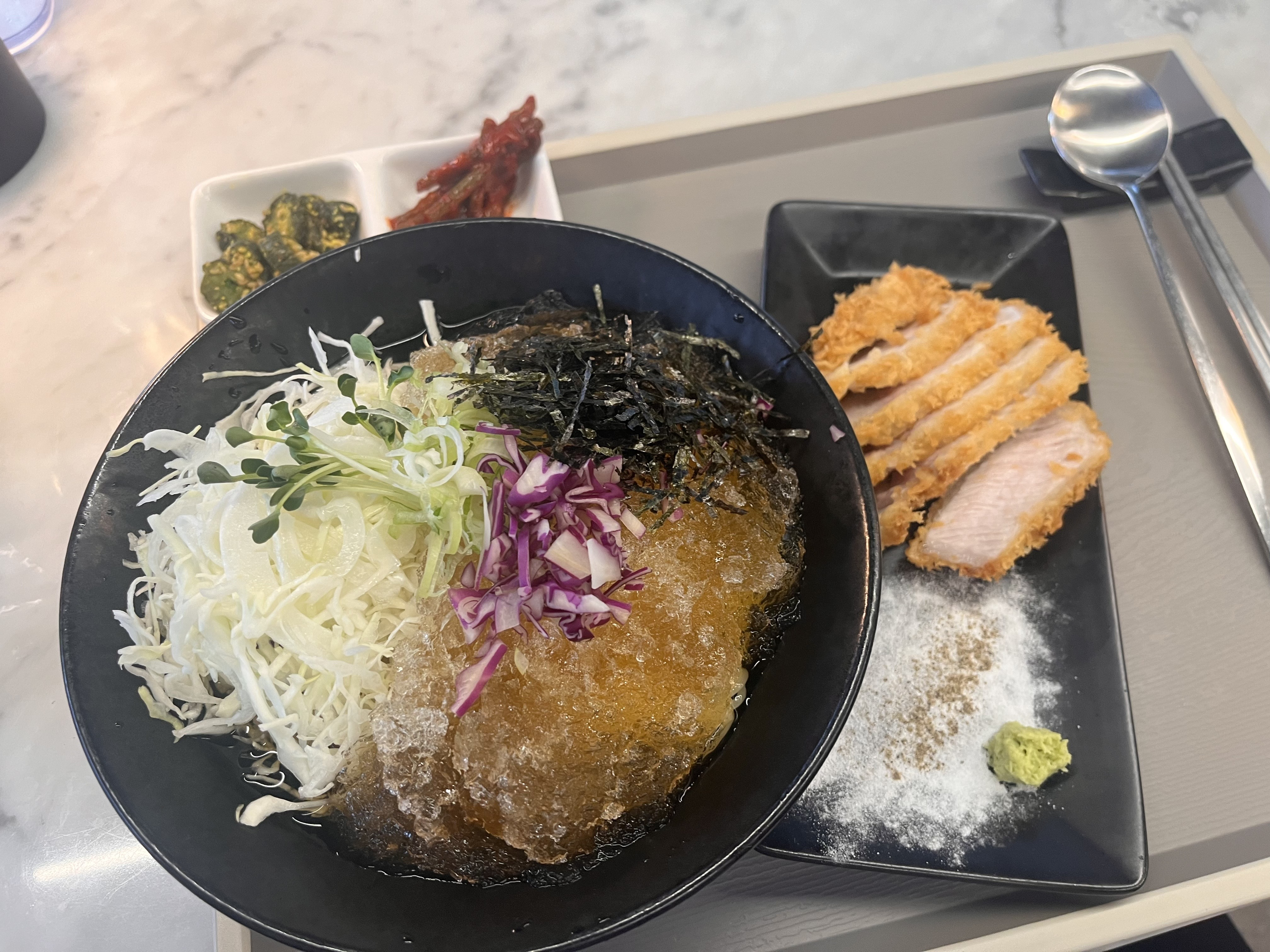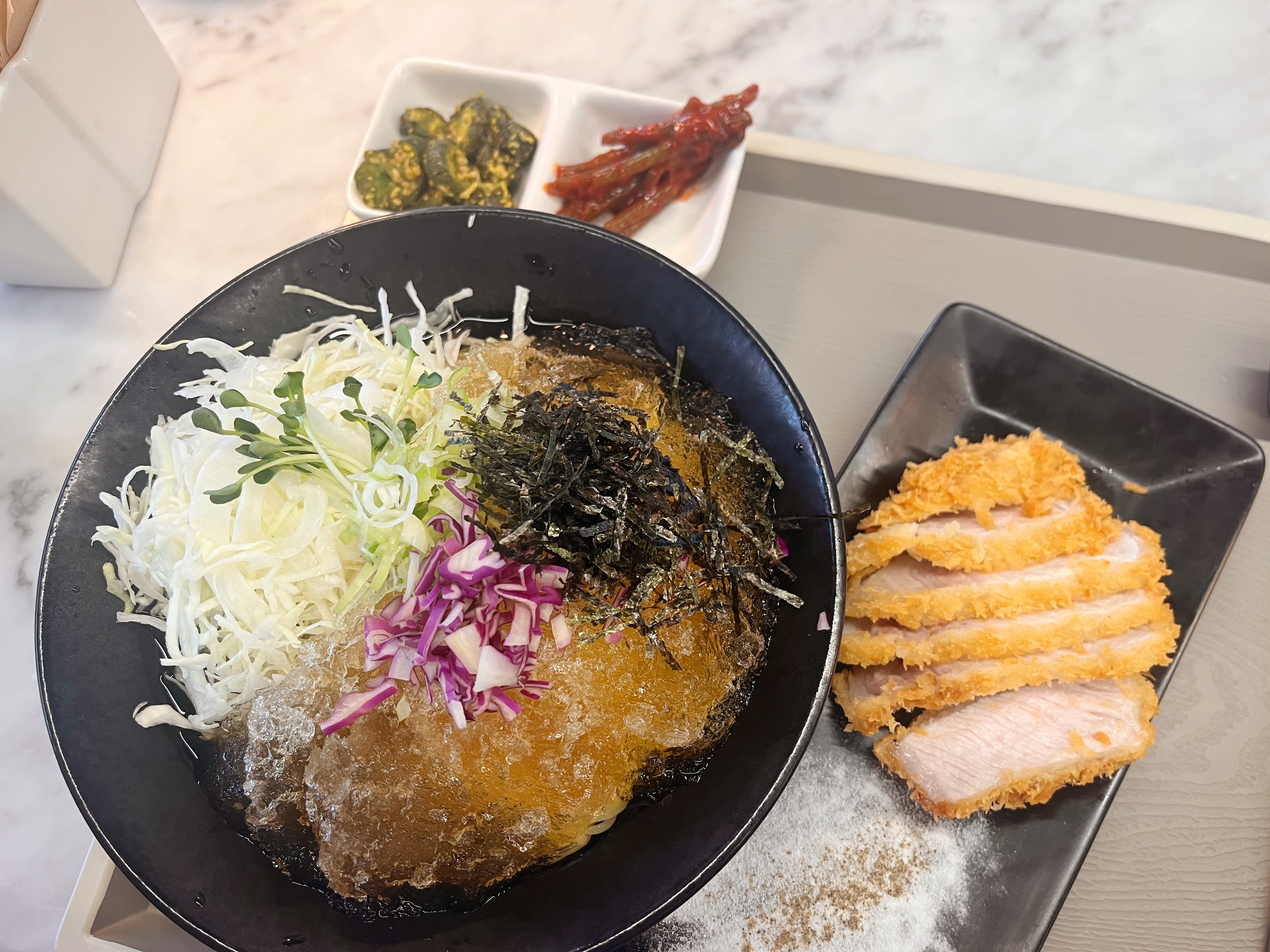 냉라면과 함께 나오는 로스카츠는 면이랑 같이 먹으라고 얇게 썰려서 나오더라구요. 그렇다고 양이 적은 건 아니고, 로스카츠 1/2인분 정도 되는 양이었어요. 냉라면과 함께 나오는 로스카츠에는 돈까스 소스 없이 소금이랑 와사비만 함께 나오는데, 개인적으로는 소스보다 소금과 와사비랑 먹는 게 훨씬 맛있긴 하더라구요. 냉라면은 일반 메밀소바랑 비슷한 맛이었는데, 메밀소바가 아니라 라멘 면이 나오고, 얇게 썰린 양배추와 새싹, 김가루가 토핑되어서 샐러드 느낌도 있고 로스카츠랑 같이 먹기 딱 좋았어요! 와- 어떻게 이 조화를 생각하셨지 생각이 듬. 함께 나온 마늘쫑과 오이지절임?도 식감이 오독오독하고 적당히 짠끼가 있어서 잘 어울렸고, 로스카츠에는 된장국도 나왔는데, 돼지고기가 들어있진 않았지만 돼지고기육수를 쓴 미소시루 맛이더라구요. 제가 개인적으로 좋아하는 깊은맛!! 곤약과 당근 등이 들어 있었는데, 식감도 적당하고 따뜻하고 좋았어요. 다만 아쉬운 점이 있다면 끝까지 따뜻하게 먹고 싶어서 그릇이 좀 더 작았다면 리필할 수 있었을텐데..? 하는 ㅎㅎ 아직 다 안 먹었는데, 데워 달라고 하기도 뭐하고, 리필해달라고 하기도 뭐해서 그냥 먹었거든요. 암튼, 전체적으로 짜지 않아서 밥 없이도 카츠를 거의 다 먹은터라 밥이 남았는데, 된장국이랑 먹으니까 냉라면으로 차가웠던 속이 든든해서 좋더라구요.