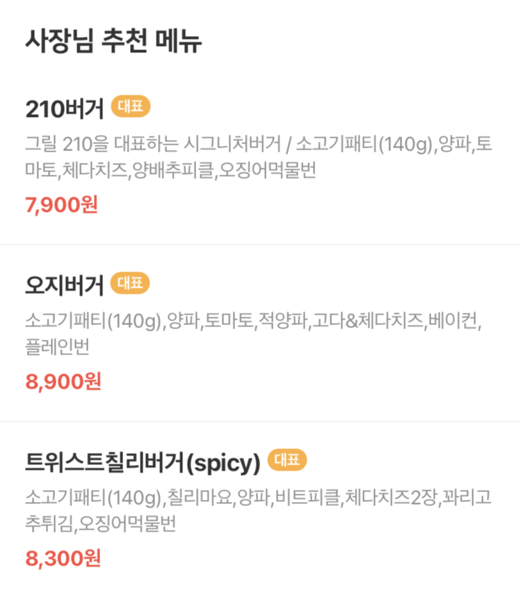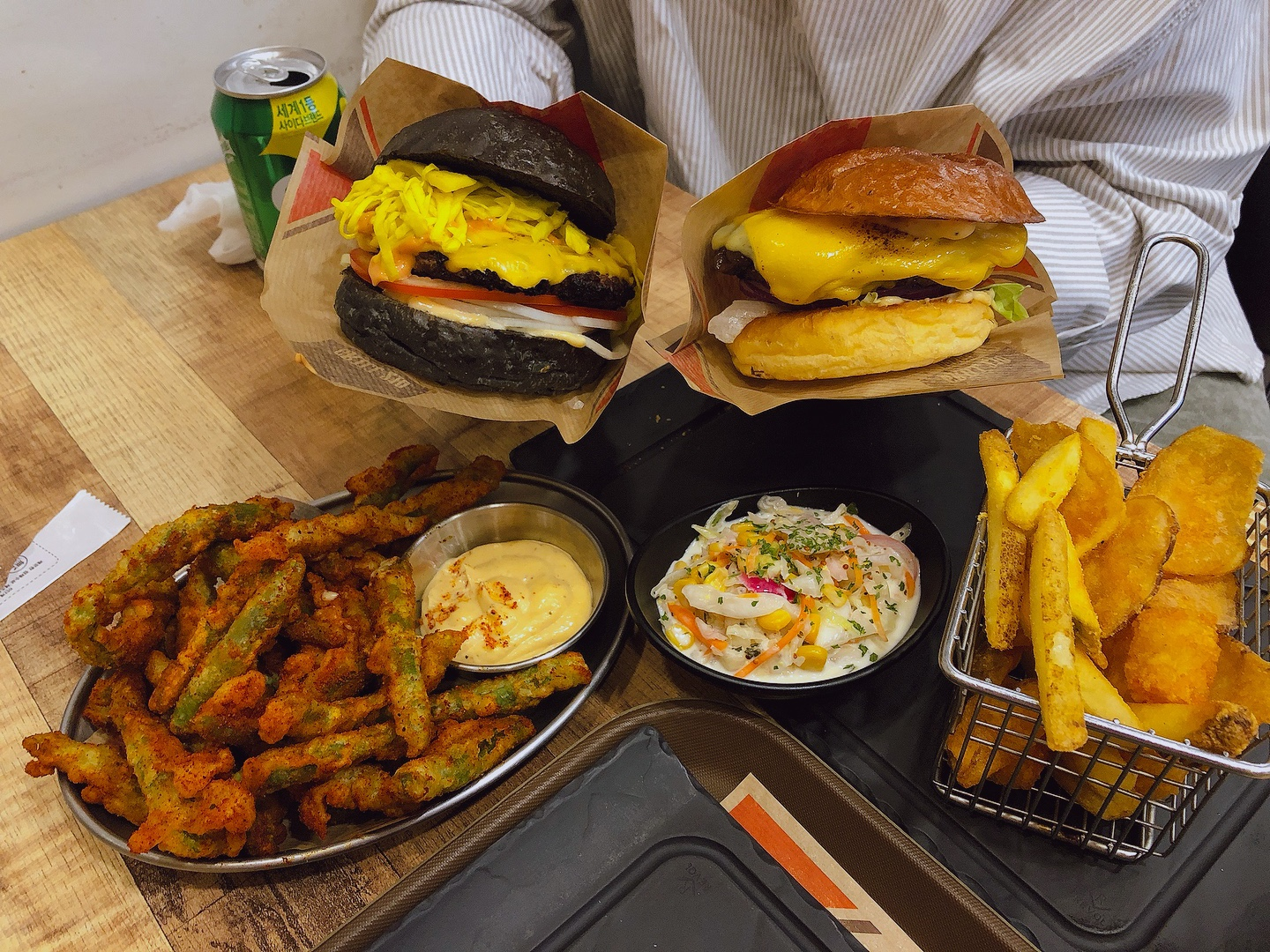 저는 밑의 사장님 추천메뉴에 있던 210버거와 오지버거를 세트로 주문했고, 꽈리고추튀김도 추가주문했습니다. 버거메뉴를 세트로 먹으면 코울슬로와 음료가 같이 나오고, 가격은 버거 가격에 3000원씩 추가가 됩니다. 여기서 코울슬로를 감자튀김으로 업그레이드 시킬 수 있는데, 500원이 더 추가됩니다. 식당 안을 보니 거의 모든 분들이 감자튀김으로 업그레이드해서 먹는 것 같았어요. 저는 하나만 업그레이드해서 감자튀김과 코울슬로 둘 다 먹어보았습니다.
