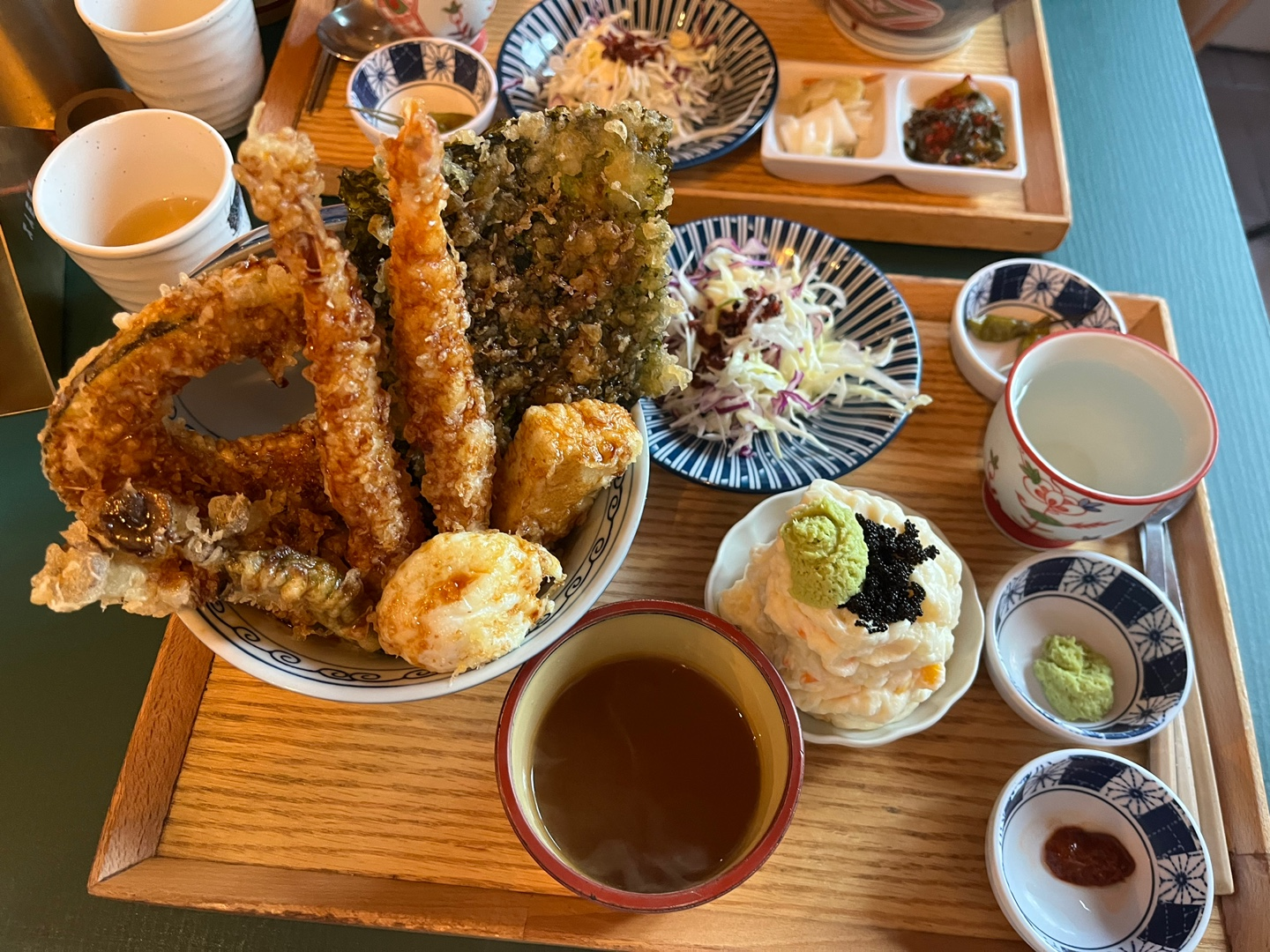 텐동의 튀김 자체는 튀김옷도 적당한 얇기이고, 먹는 내내 느끼하지 않고 무엇보다 짜지 않아서 좋았습니다. 솔직히 온센텐동은 좀 짰거든요.. 그리고 버섯도 가끔 냄새가 거슬리는 튀김을 볼 때가 있는데 잡내가 안 나고 식감도 좋았어요. 최근에 가본 미사텐동이라는 곳도 다른 튀김들은 다 좋은데 수란이 완숙이라는 점에서 탈락!