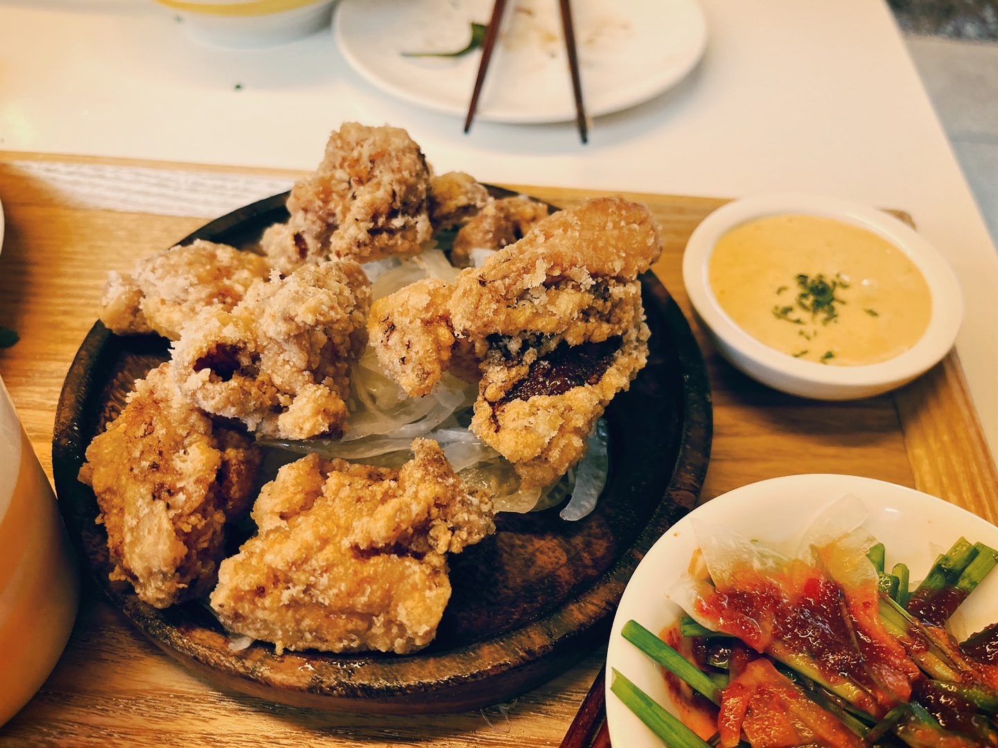 사이드메뉴로 가라아게도 시켰는데, 소스를 싫어하는 남친을 위해 소스는 따로 담아달라고 요청드렸어요. 달달해서 맛있긴 했는데, 남친이 좋아하는 가라아게 스타일(아비꼬에서 나오는 가라아게 스타일)은 아니어서 조금 아쉬웠다는! 연유계란드레싱이 달달해서 저는 맛있게 먹었습니다! 하지만 다음에 가면 다른 사이드메뉴를 시킬 거 같아요!