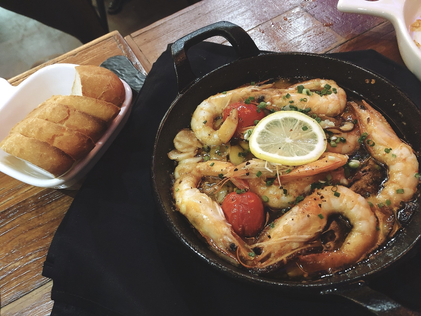 안주로 시킨 나초는 같이 나온 치즈소스가 뒷맛이 매콤하고 나쵸자체도 맛있어서 가볍게 먹기 딱 좋았던 거 같아요.😊 끊임없이 들어가는 나초.. 하지만 배부르지 않게 먹을 수 있었었요. 나중에는 좀 배고파져서 감바스도 시켰는데요. 산티아고 감바스에는 새우, 방울토마토, 표고버섯, 양파, 쪽파, 레몬, 마늘 등이 들어가 있었고, 바게트도 함께 나왔어요. 새우도 토실토실 탱글탱글하고, 모든 재료에 간과 양념이 잘 베어 있어서 맛있게 먹었어요!! 여기 안주 잘하는듯. 제가 만들면 왜 이런 맛이 안 나는 걸까요? 안주를 두 가지 밖에 안 시켰지만 둘 다 너무 맛있어서 다른 메뉴도 틀림없이 맛있을 거 같다는 확신이 드네요. 다음에 오면 식사부터 파스타로 여기서 해야겠어요. (광고 절대 아니고 내돈내산 찐후기)