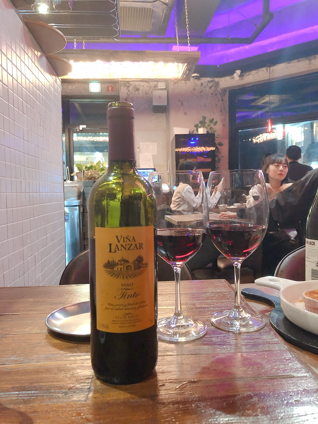 TMI지만 저희가 싸우고 기분을 풀겸 마신 거라서 술을 좀 더 마시게 되었습니다, 허허. 그런데 가격이 좀 부담되어서 하우스와인이었던 레드와인을 보틀로 주문했어요. 1보틀 18,000원 정도였던 거 같아요. 약간 스모키한 향이 나면서 단맛이 있는 와인이었는데, 나쁘진 않지만 제가 스모키한 주류를 좋아하지 않는지라 선택미스였습니다. 저는 스모키하면 뒷맛에서 좀 거부감이 들던데, 저와 다른 취향을 가진 분들이라면 저렴한 가격으로 와인을 즐기실 수 있을 거 같아요.