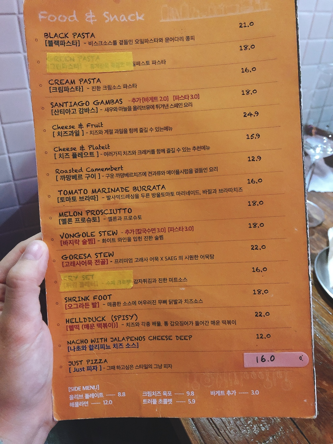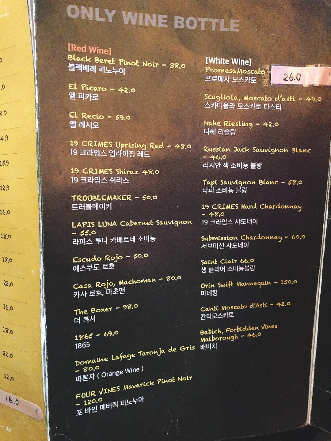 와인 종류가 꽤 많았는데, 제가 와인은 잘 몰라서 추천을 받았어요. 저는 레드와인보다는 화이트와인을 선호하고 너무 달지는 않으면서도 과실향 때문에 상큼하게 느껴지는 와인을 선호하는데요. (과음은 금물이지만 하루에 1잔 정도 마시면 레드와인은 노화방지, 화이트와인은 다이어트 효과가 있는 거 알고 계신가요?) 그렇게 설명드렸더니 [러시안 잭 소비뇽 블랑]이라는 와인을 추천해주셨어요. 와인이 맛있어서 나중에 인터넷으로 알아보니까 마트에서는 2만원 중후반대 가격으로 팔고 있었어요. 메뉴판의 보틀 와인 가격을 보면 사입하시는 가격의 2배 정도로 판매하시는 거 같아요. 가격이 2배라고 생각하면 비싸단 생각이 들기도 하지만 아마도 일반 레스토랑에서 와인을 주문하시는 것보단 저렴하게 드시는 거라고 생각됩니다. 저렴한 2만원대 보틀와인(하우스와인은 보틀로 18,000원, 밑에 나옴)도 있고, 보틀로 마시지 않고 기분만 내실 분들은 1잔씩도 팔기 때문에 가볍게 안주 1가지에 와인 1~2잔씩만 마신다면(가장 저렴한 게 2,900원) 괜찮을 것 같아요.