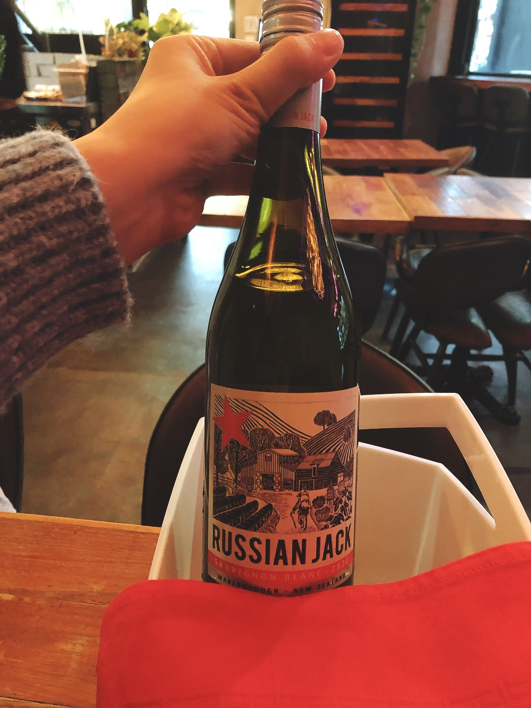 제 와인 취향을 말씀드리고 추천 받았던 [러시안잭 블랙 소비뇽 블랑]은 직원 말로는 팬층이 두터운 와인이라고 하더라구요. 와인을 잘 못 마시는 사람도, 좋아하지 않는 사람도 즐길 수 있는 와인이라고 합니다. 저도 실제로 먹어봤을 때 딱 제 취향저격이라는 생각이 들었어요. 마시면 바로 파인애플처럼 톡 쏘는 쨍한과실맛이 느껴지고, 드라이하면서도 끝맛은 스윗합니다. 그렇다고 엄청 달거나 한 게 아니고, 뒷맛만 살짝 달게 느껴져서 깔끔하게 마무리되는 맛이에요. 도수는 13도! 제가 와인에 좀 약한 편인데, 1병을 둘이서 마시니까 살짝 취하더라구요. 이 와인 너무 마음에 들어서 다음에 와인을 마실 일이 생긴다면 꼭 이 와인을 사서 마실 거예요!