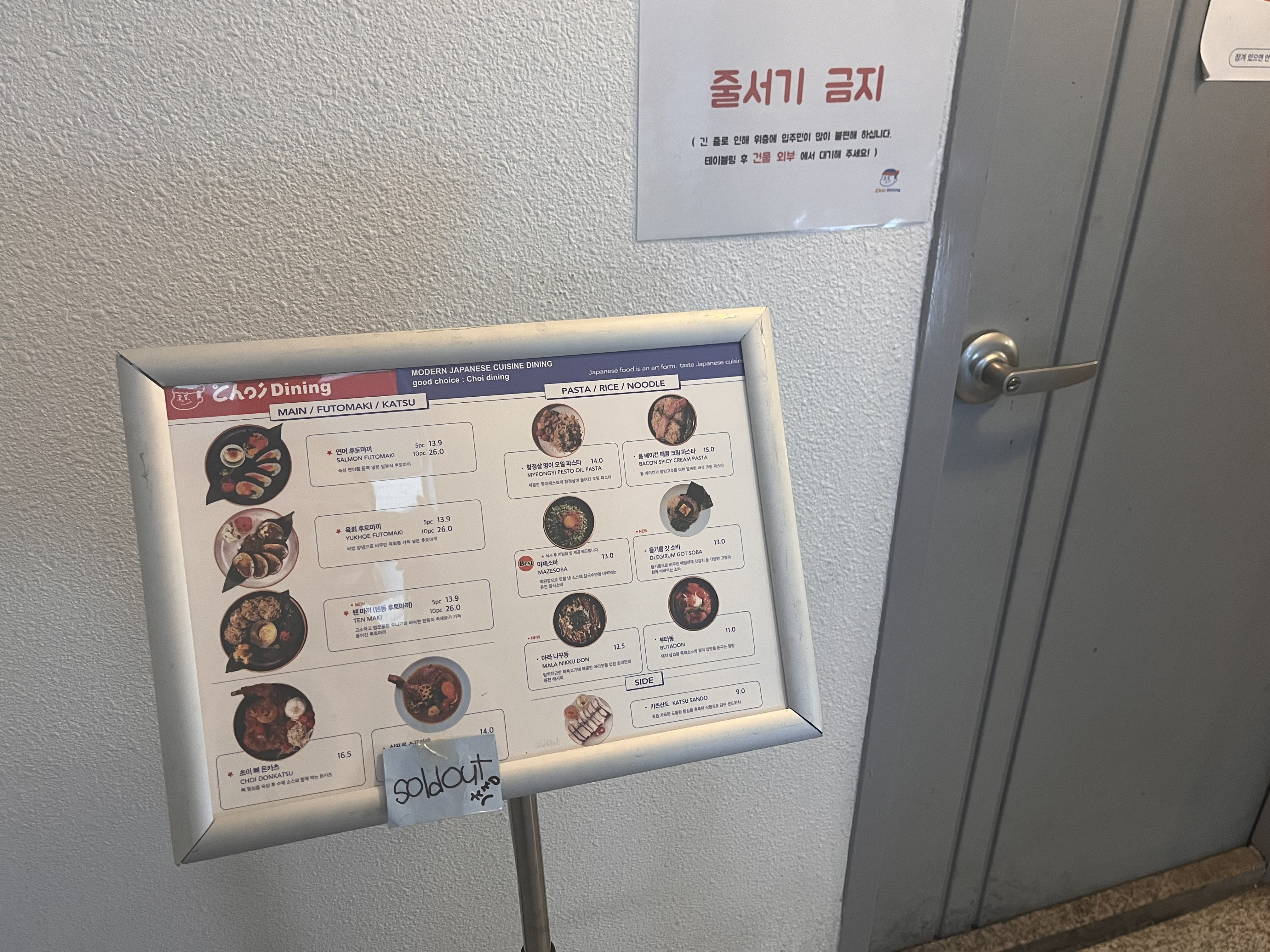 머리에 띠를 두르고 있는 것이 누가 봐도 일본스러운 캐릭터에, 영어Choi를 일본어どんっン가 겹쳐보이는 서체로 쓴 것이 재밌었어요. 일본어를 직업으로 하는 저지만 첨엔 도대체 어떻게 읽는 건가 하다가, 아 Choi구나 알았어요. 아마도 양식이나 한식에서 모티브를 얻어 퓨전일식을 하는 것을 서체로 상징적으로 표현한 걸까요? 송리단길 맛집 검색을 하면 초이다이닝이 항상 나오는데, 음식들 비쥬얼이 좋아서 언젠간 한 번 가봐야지 저장해놨던 집인데요. 평일 7시 되기 바로 전쯤에 도착했습니다.